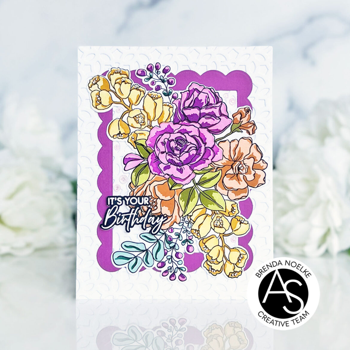 For the background, I die-cut the Alhambra Arabesque Cover Die from white cardstock and layered it onto an A2 white card base. I die-cut a frame from orchid cardstock using two dies from the Nested Scalloped Frames Die Set and adhered it to the background with liquid glue, along with the floral die-cut.