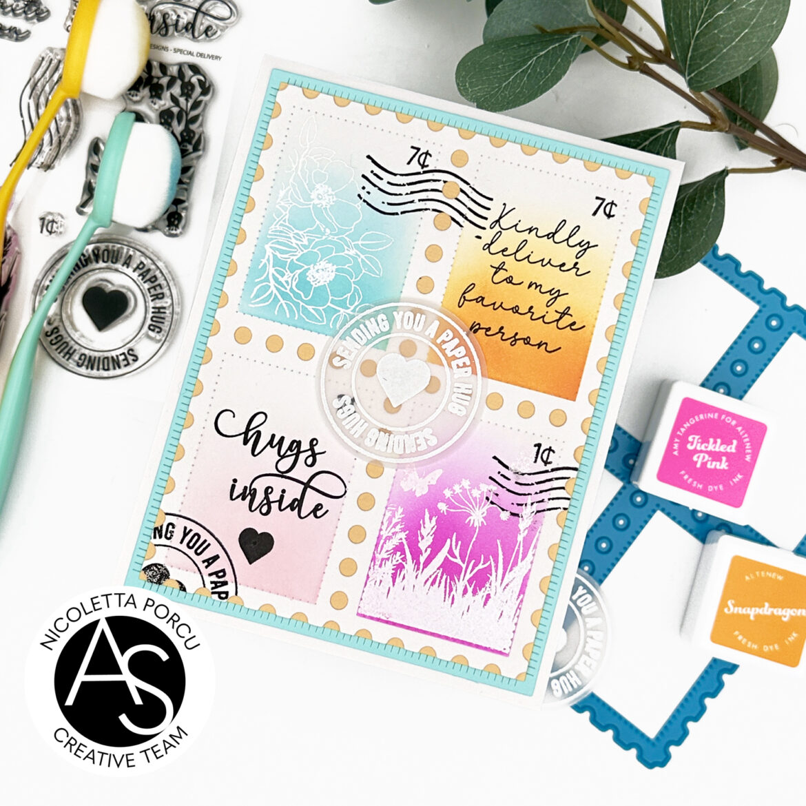 To male it I started by die cutting the Postage Stamp cover from a white Neenah cardstock and using the Postage Stamp stencil, I blended the 4 stamp backgrounds using Altenew inks: I chose light pink , pink , orange and blue green shades.