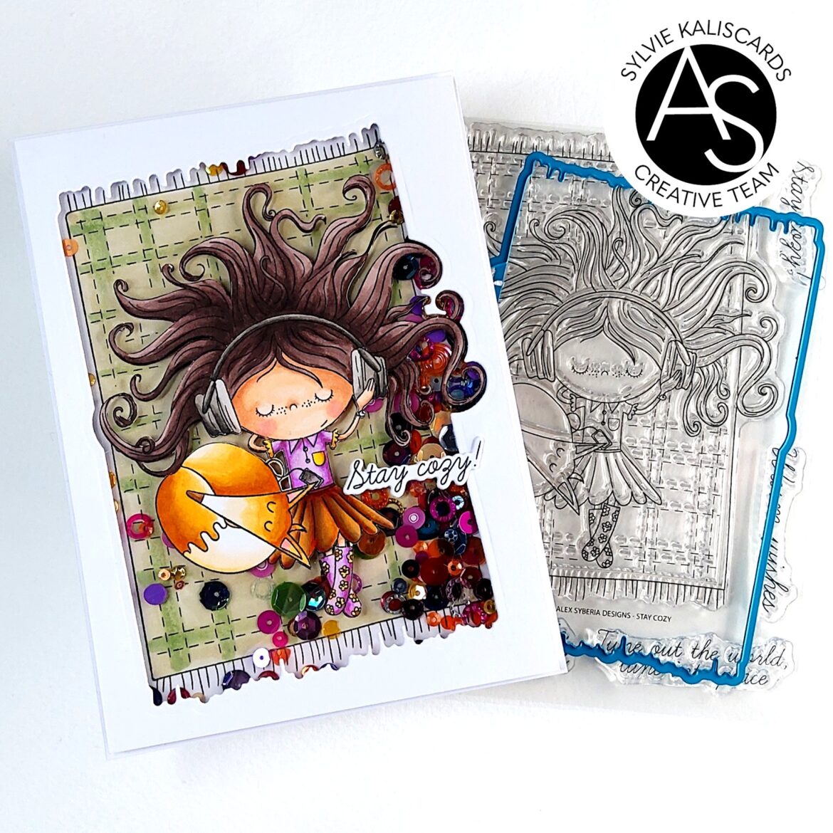 Stay cozy! It’s all in the sentiment. This is the main reason I love Fall and Winter as they are an invitation to stay cozy and allow yourself to preserve a comfy and warm bubble around you, sip a hot chocolate while reading a good book or in the case of this sweet girl, listening to music. I couldn’t help myself to turn this card into a shaker.
