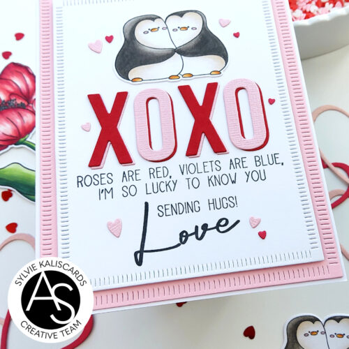 I placed the small rectangle panel in my stamping press and temporarily placed the penguin couple and XOXO letters. I then stamped the first two sentiment from the Penguin love right below the XOXO letters and the Love sentiment from the From our hearts stamp set.