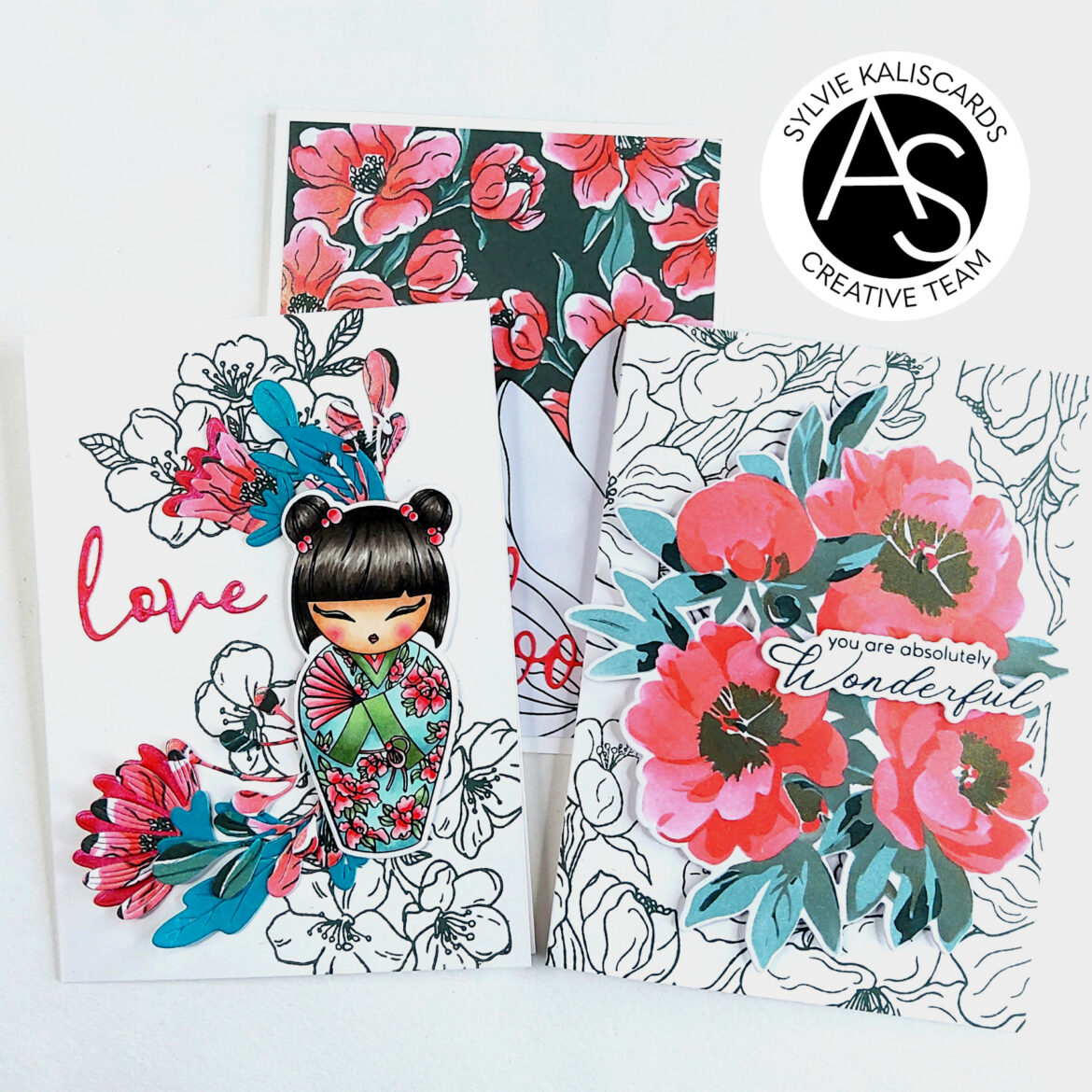 I adhered the flowers and sentiment with liquid adhesive and the Kokeshi with foam tape.