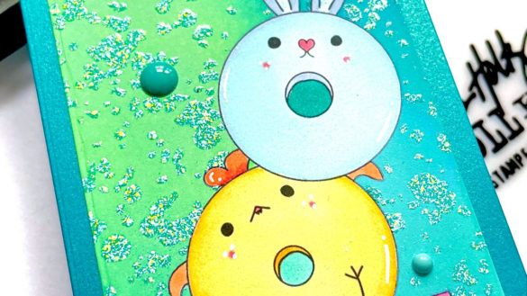 I added some enamel dots in co-ordinating colours and then, using double sided sticky tape, I adhered the top layer onto Papermill Directs ‘Curacao Cocktail Double Sided Pearl Card 290gsm‘. This card stock is a dream and has a really lovely golden shine when in the light!