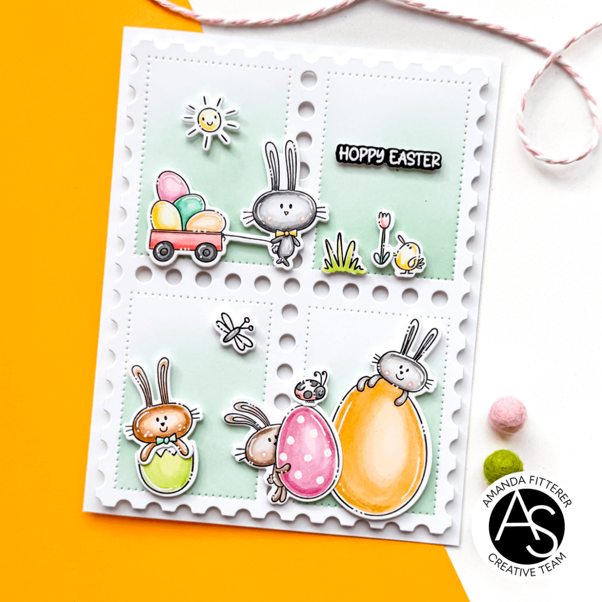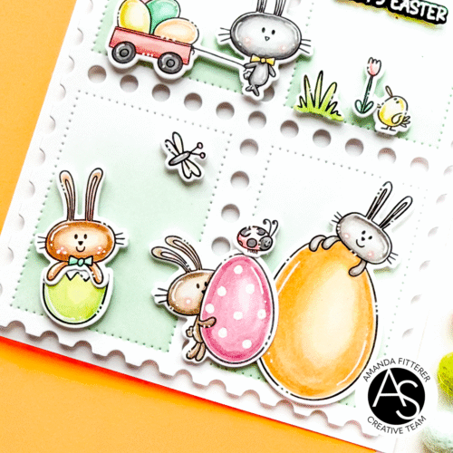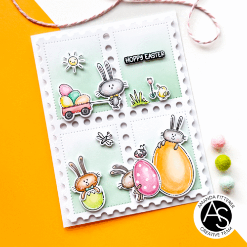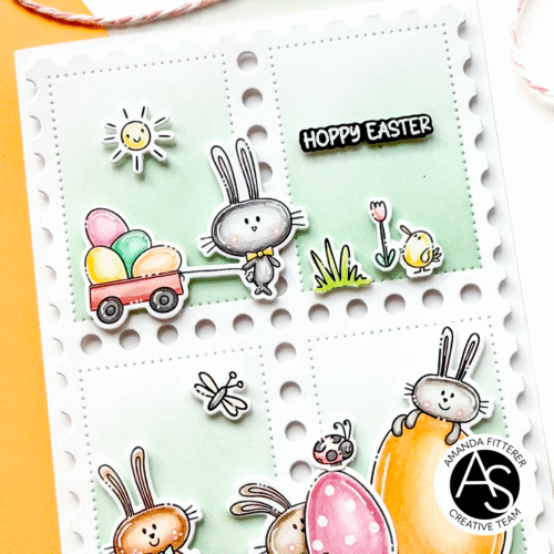 This card was so much fun to make with those adorable new Hoppy Easter Stamps! I also used my all time fav – the Postage Stamps Cover Die and Stencil!