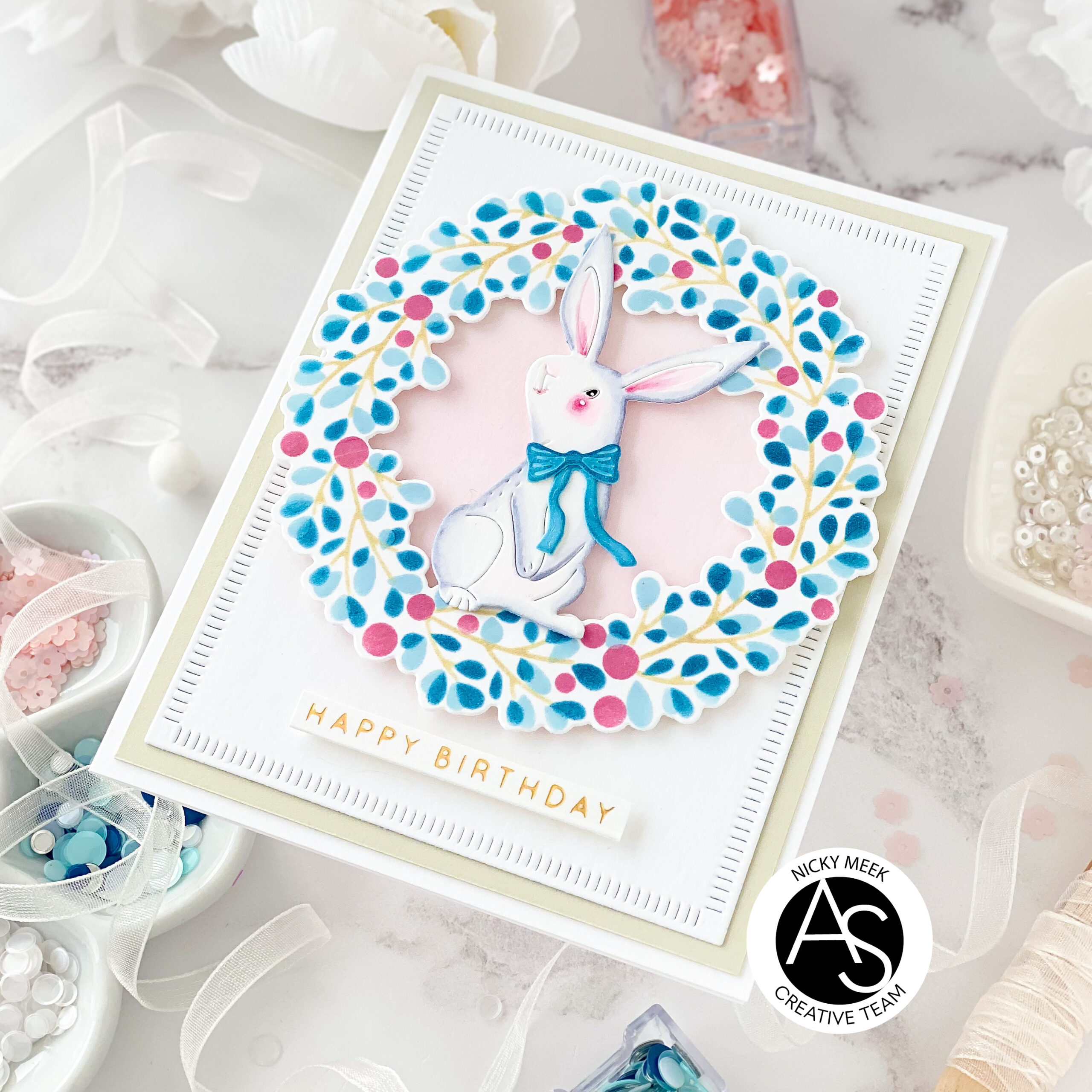 I die cut a bunny using the Cheerful Meadow die and I coloured it with Copic markers in C3, C1, C0, RV34, R83, R81, RV00, RV0000. This was applied with foam tape to the middle of the wreath.