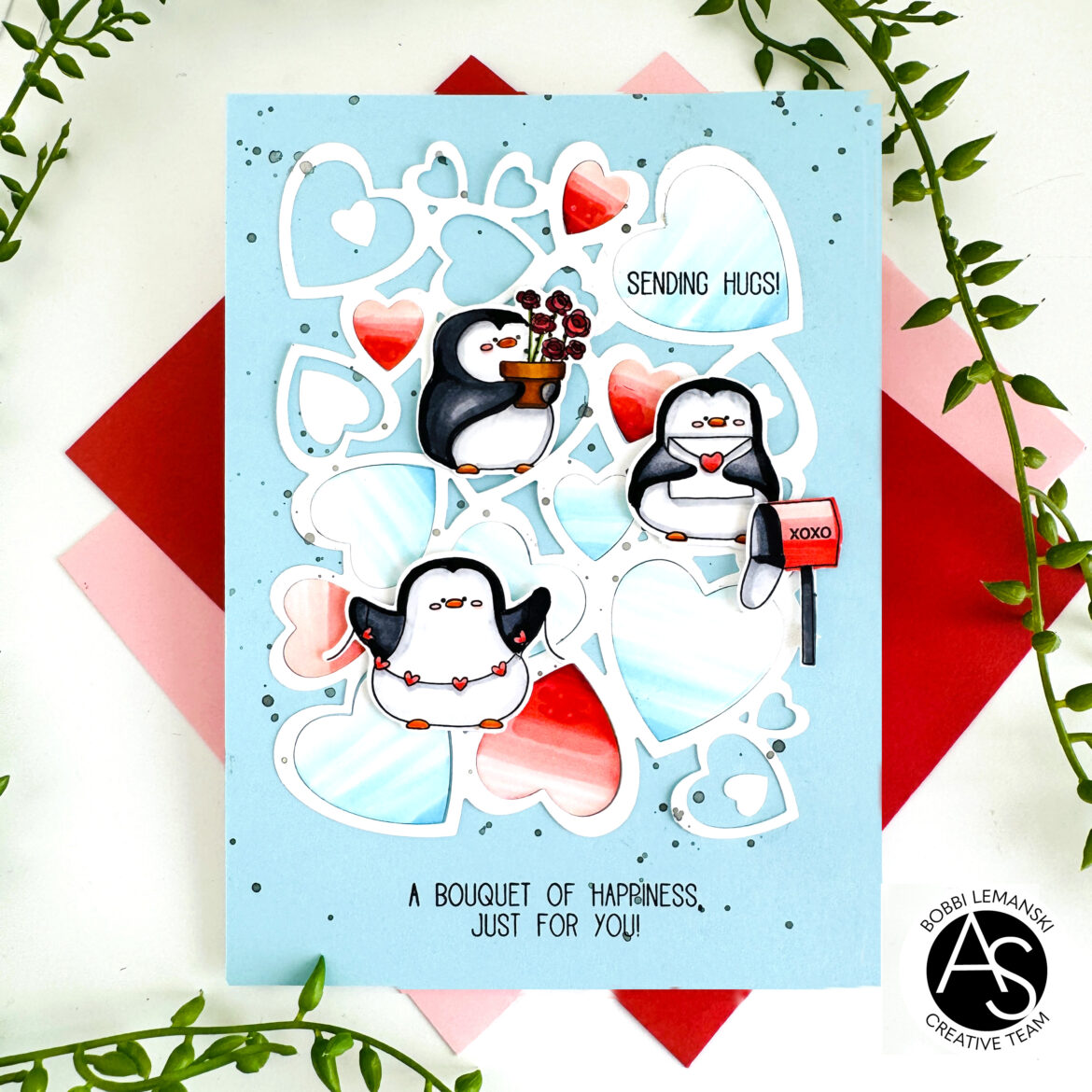 To make this 5″ X 7″ card, I splattered black watercolor paint over the blue card front. Next, I die cut and attached the Heart collage from white cardstock using the Heart Collage Die. I took some of the heart cutouts from the collage and colored them in an ombre effect using Copic markers in shades of red and blue. I attached them back into the collage frame. I stamped a cute phrase from the Penguin Love stamp set in black, below the collage frame and one in the upper, right corner heart, “sending hugs!”