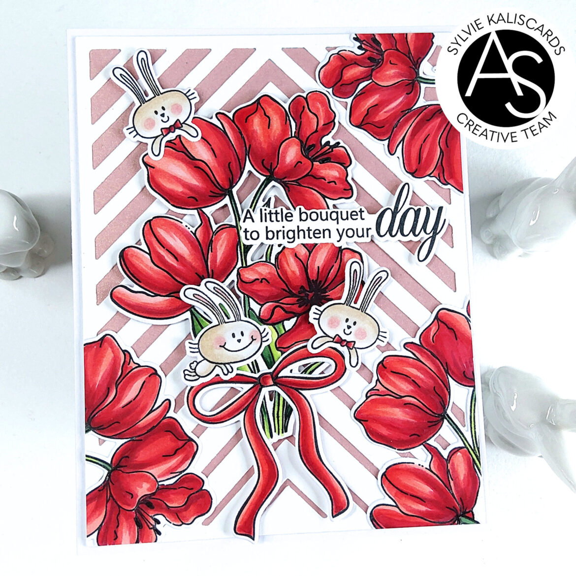 Sylvie @kaliscards here! You know I love to mix florals with critters and I think this one turned out really cute. I used the @alexsyberiadesigns Hoppy Easter set, which you can also use all year round, and the Tulips in bloom set. For the background, I used the Chevron chic cover die.