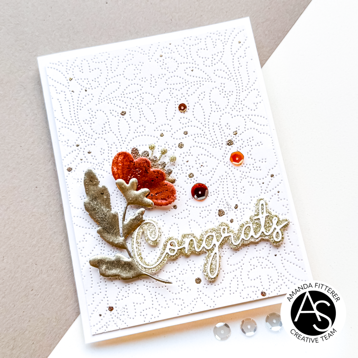 I created the background for this card using the Charming Flora Cover Die. I trimmed the cardstock to 4″x5.25″ so that it would fit nicely on my A2 card base. I added some gold splatters using a WOW! embossing pen and the Platinum Ultra High Embossing Powder.