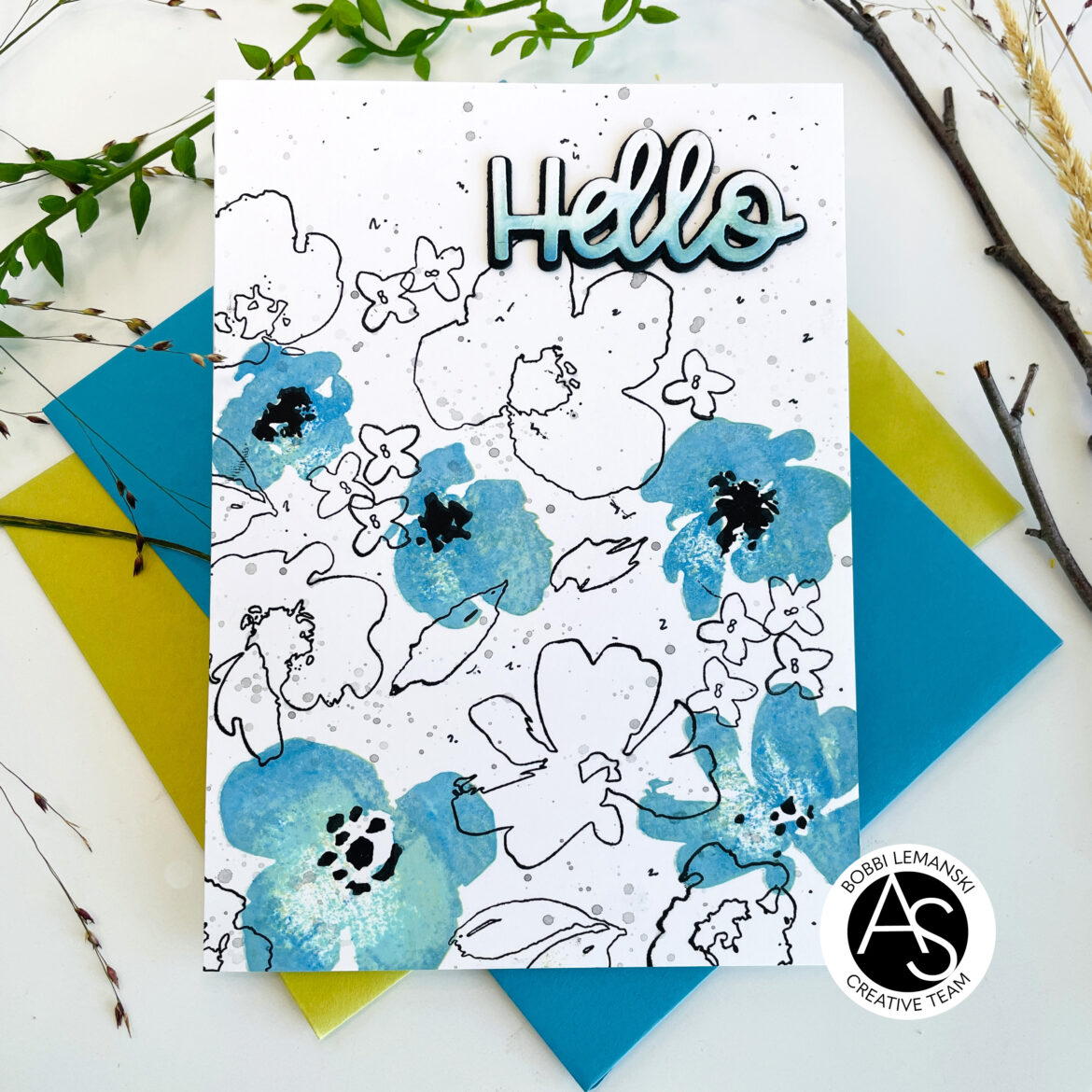 I stamped the flower centers using the same black ink. I spattered black watercolor ink over the entire front panel and let it dry. I attached the “hello” at the top right corner to complete the card.