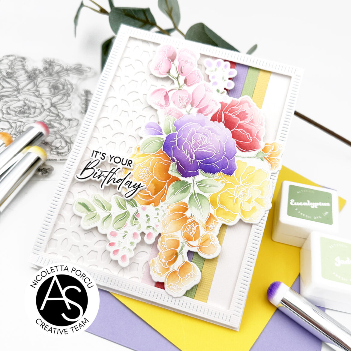 Next up I used the Birthday Bouquet stencil set and the Altenew inks to color the image, and as I finished I die cut it using the Birthday Bouquet die set.