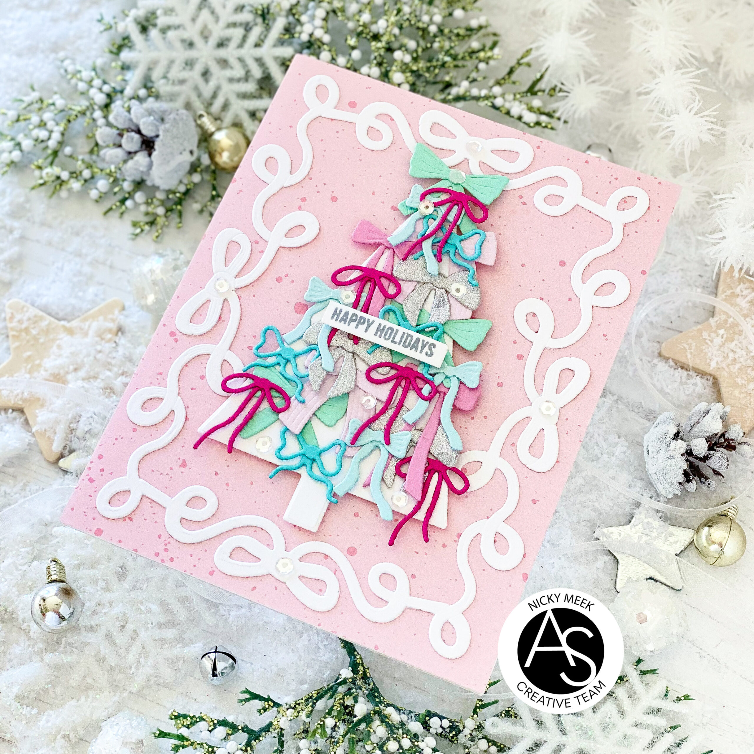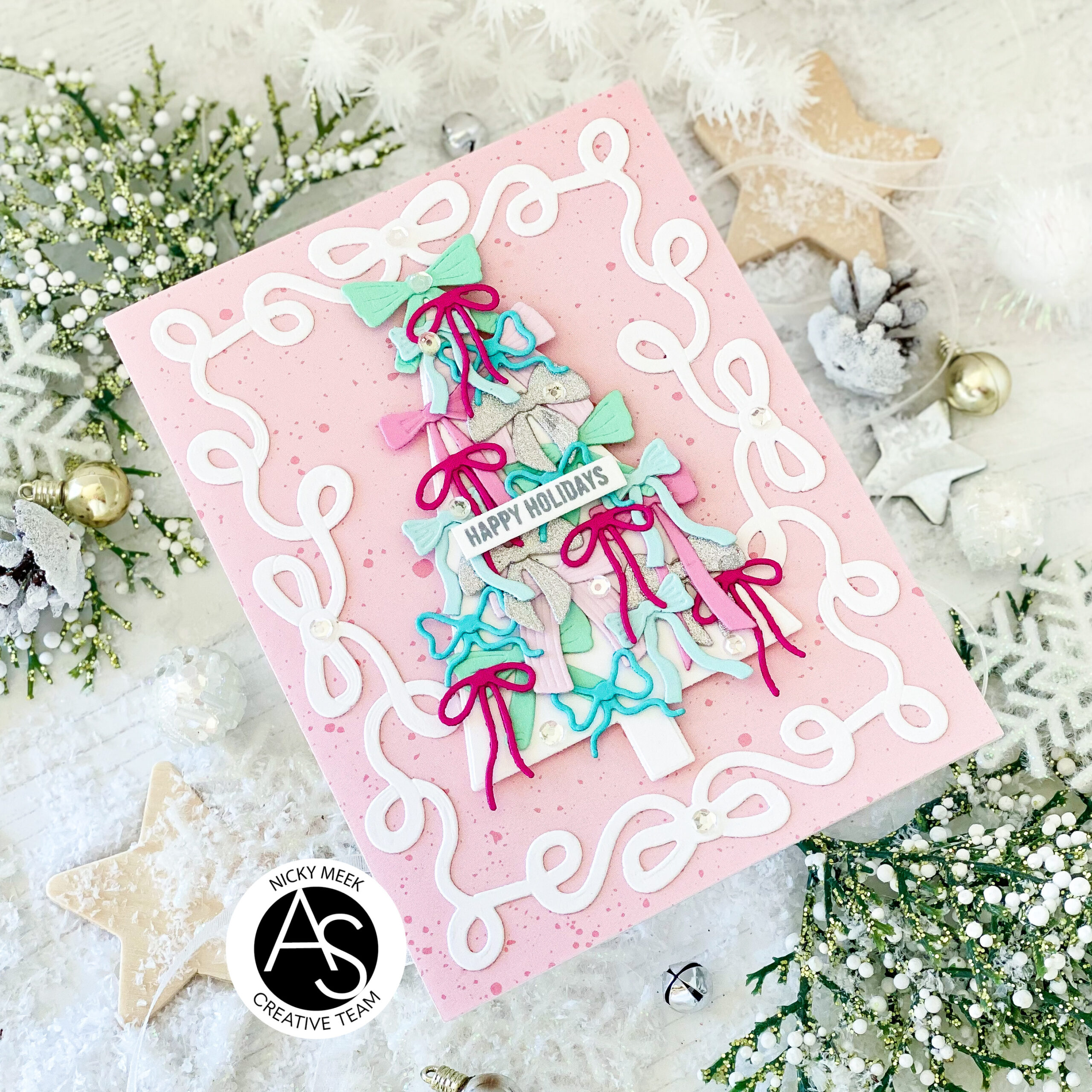 Hi! This is Nicky with you today on the Alex Syberia Designs blog and I’m sharing a Christmas card featuring products from the October 10th release. To create this card I have used the ‘Build-A-Bow Christmas Tree Die Die Set’, the Bow Ho Ho Frame Die Set and the previously released ‘Christmas Sentiments’ stamp set.