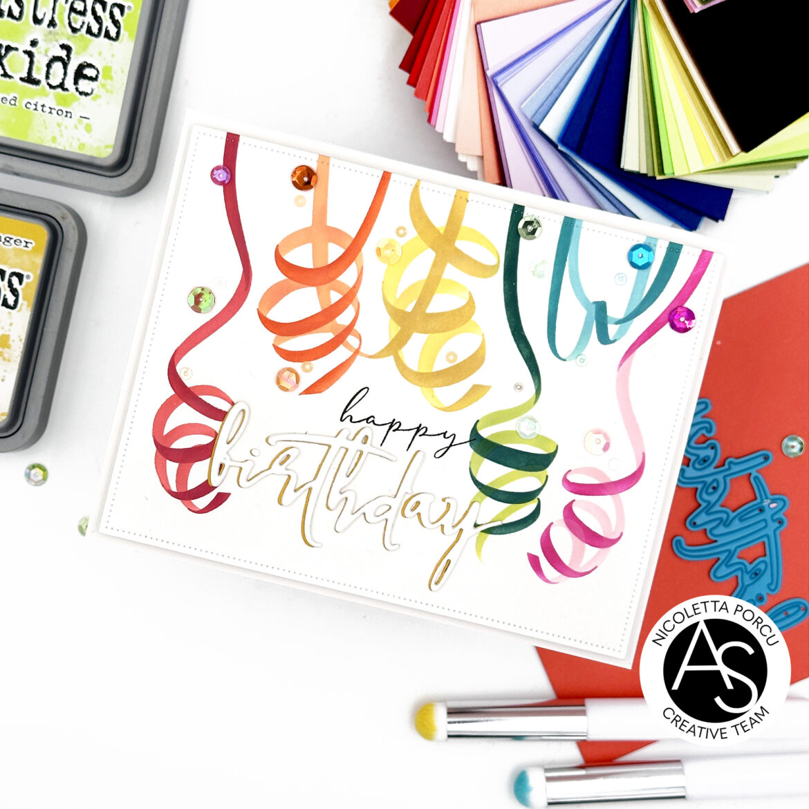 To make it I used the Carnival Party Stencil and die set, using rainbow colors to create the streamers. I used two shades of the same colorr for every streamer, the light one for the inside and and the darker for the outer part.