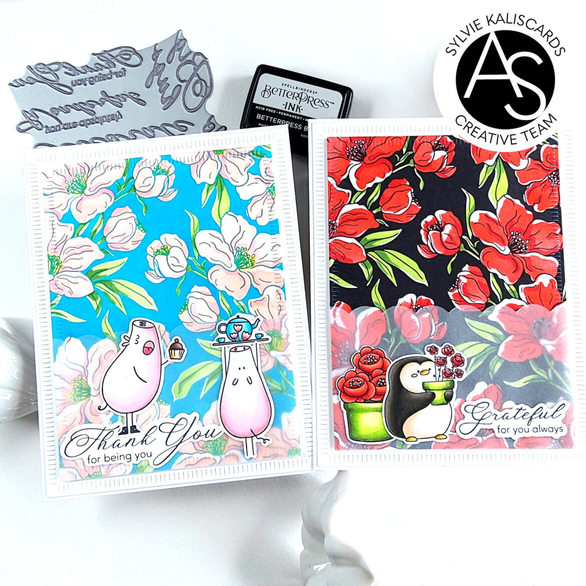 Sylvie @kaliscards here with a couple cards sharing the same design, using the Charming floral background press plate.