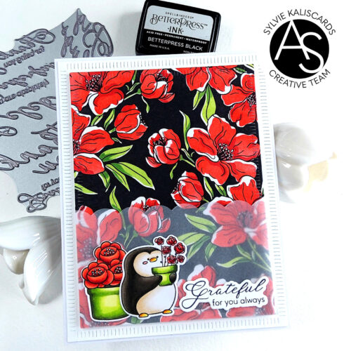 For both cards, I inked the background panel on Copic-friendly cardstock using the Charming floral background press plate and the Spellbinders Press plate system with Black BetterPress ink on one panel and Hydrangea ink on the other.