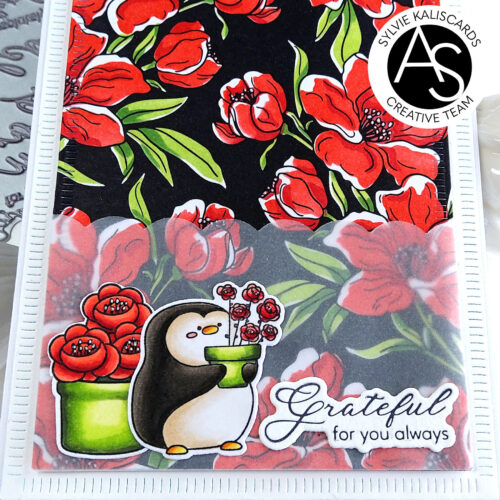 I colored the images with Copic markers and used the coordinating dies for the Penguin love, Happy hog day and Spring bunnies sets. For the basket of roses, I did partial die cutting on the pot and placed the top plate of the die cutting machine at the limit of the pot before the roses, to leave them uncut. I then fussy cut around the roses with scissors.
