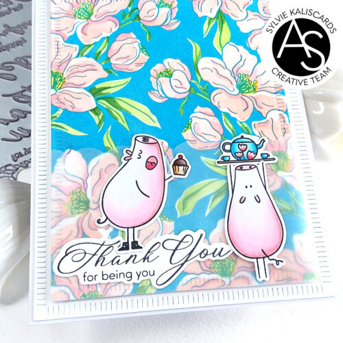 Next, I stamped the images from the Happy hog day and Penguin love stamp sets. To decorate the tea pot, I stamped the tulips from the Cheerful Panda moments stamp set. And for the basket of roses, I used the Spring bunnies stamp set and did a bit of masking to stamp 3 roses from the Penguin love stamp set instead of the original carrots.