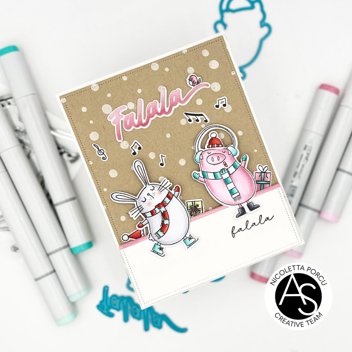 I used the Falala Friends stamp set and coordinate dies, the Falling Snow stencil, the Falala die and the Nested Scalloped Frames die set.