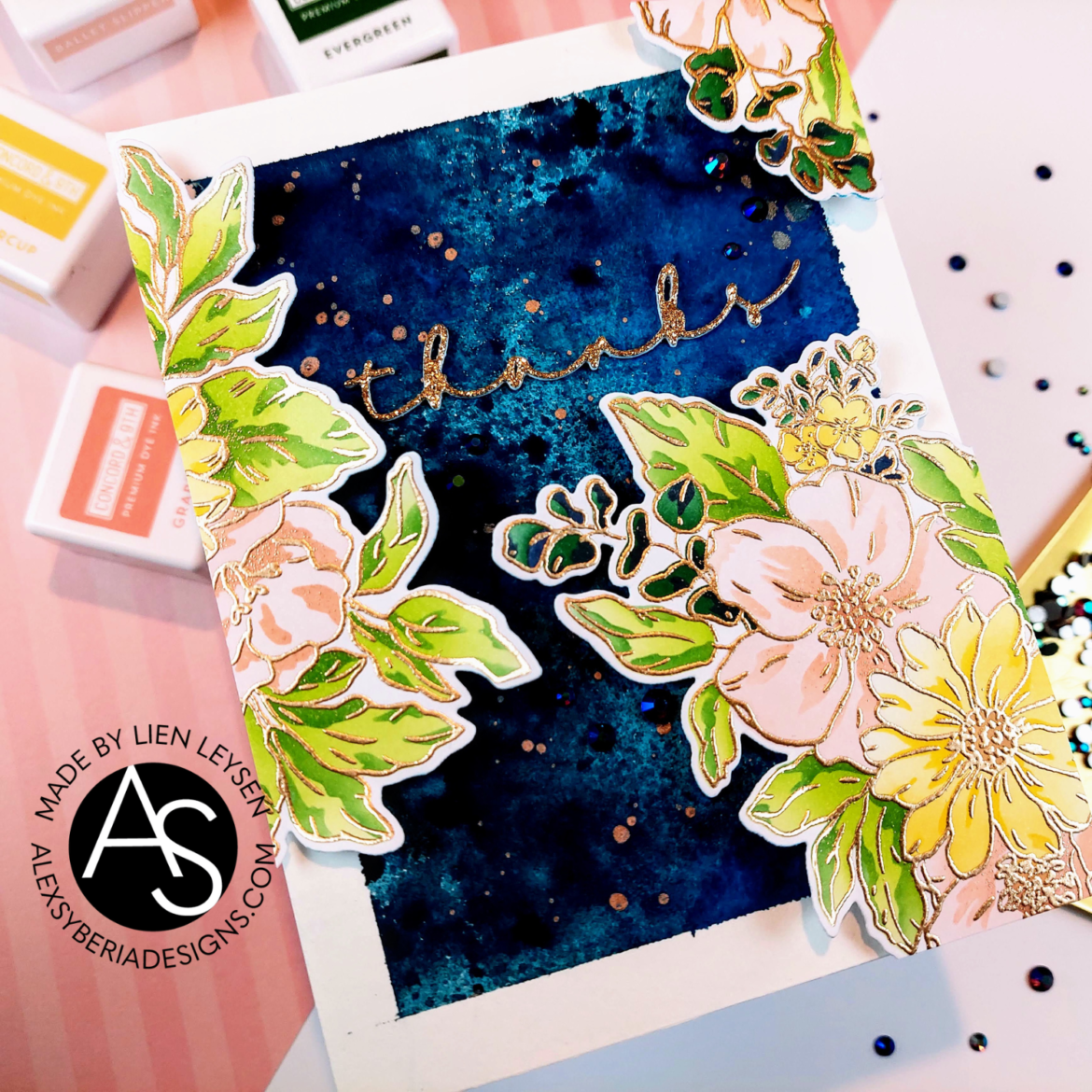 For my sentiment I used the gorgeous Thanks die cut from gold glitter cardstock. I finished it off with a few blue gems and that’s it.