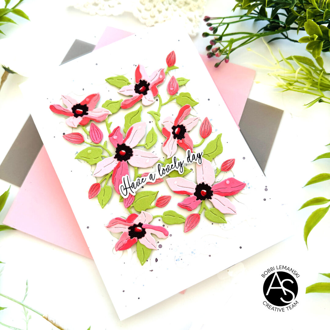 It’s time to think spring flowers and I am all for it! My card features the new Clematis die set by Alex Syberia Designs. It’s an intricately designed floral that is so beautiful in any color. While clematis are most known for their deep purple color, I chose pinks for this card. The sentiment is from the Lovely Day stamp & die bundle.