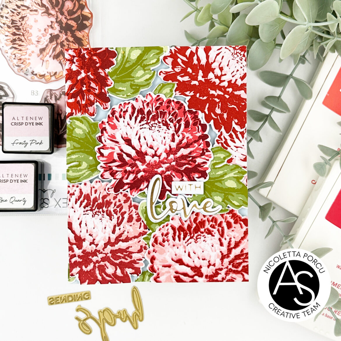 I continued adhering the die cuts on a light blue card base , using foam pads to give dimension and as last thing I added the sentiment “With Love” made by foiling in gold the Love & Hugs Hotfoil Plates and die cutting it with the Love & Hugs Die Set. I die cut the sentiment in many layers and I glued them together and then I add it on the card.
