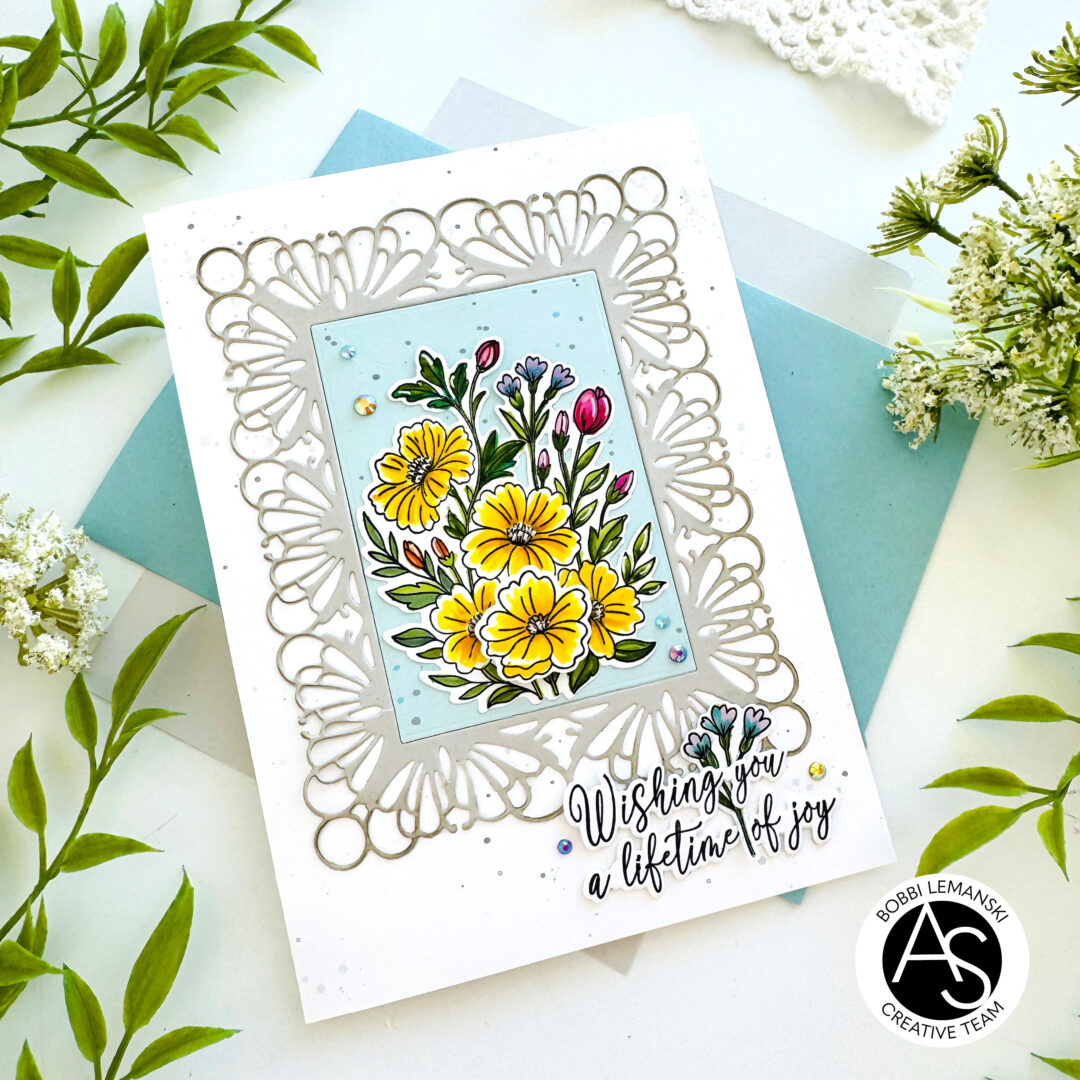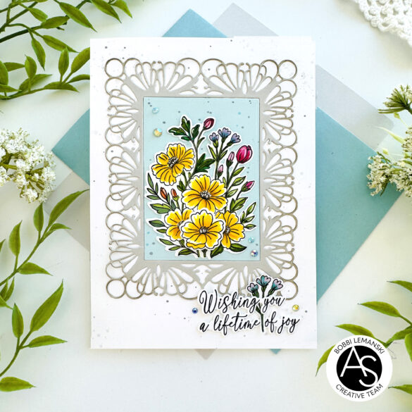 Hello, crafty friends! With winter in full swing, it’s fun to think about spring and new, budding plants in our gardens, spring weddings and budding love! Today, my card features new blossoms and a delicate frame from the December 2025 release. I’m using the following Alex Syberia Designs products for this 5″ X 7″ wedding card: