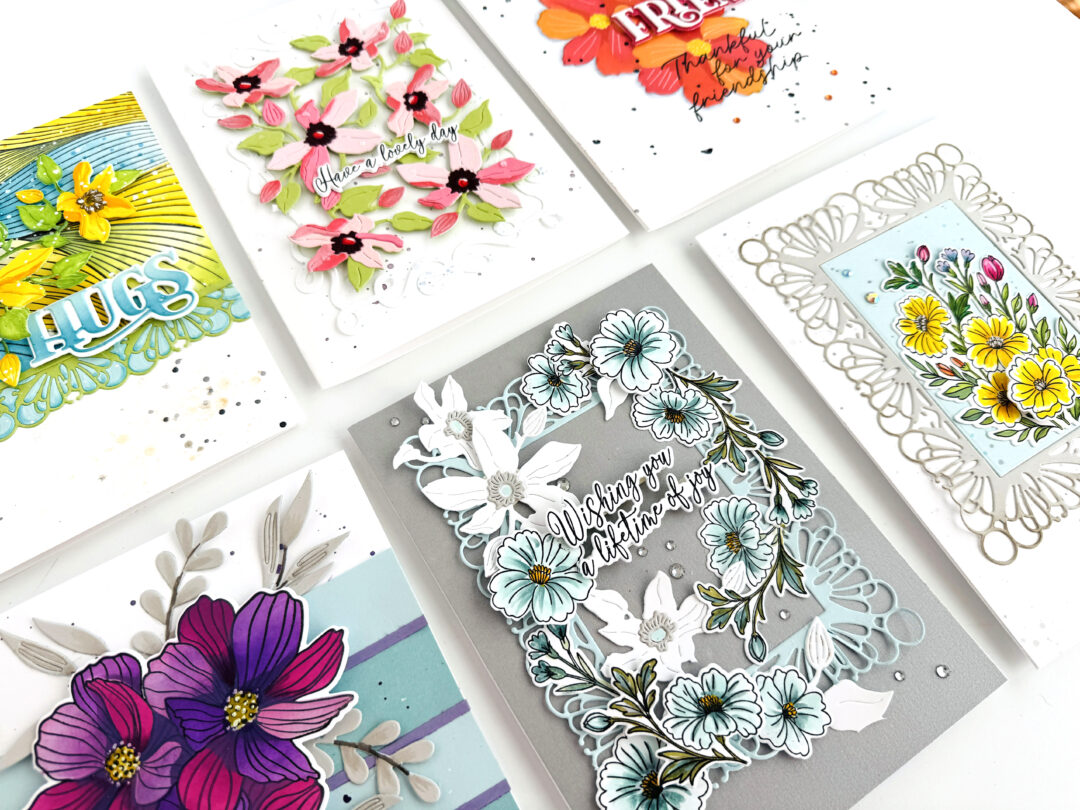 I also stamped and die cut a single yellow flower and attached it to the larger bouquet for more dimension. You can really see it in the side angle on the collection photo below.
