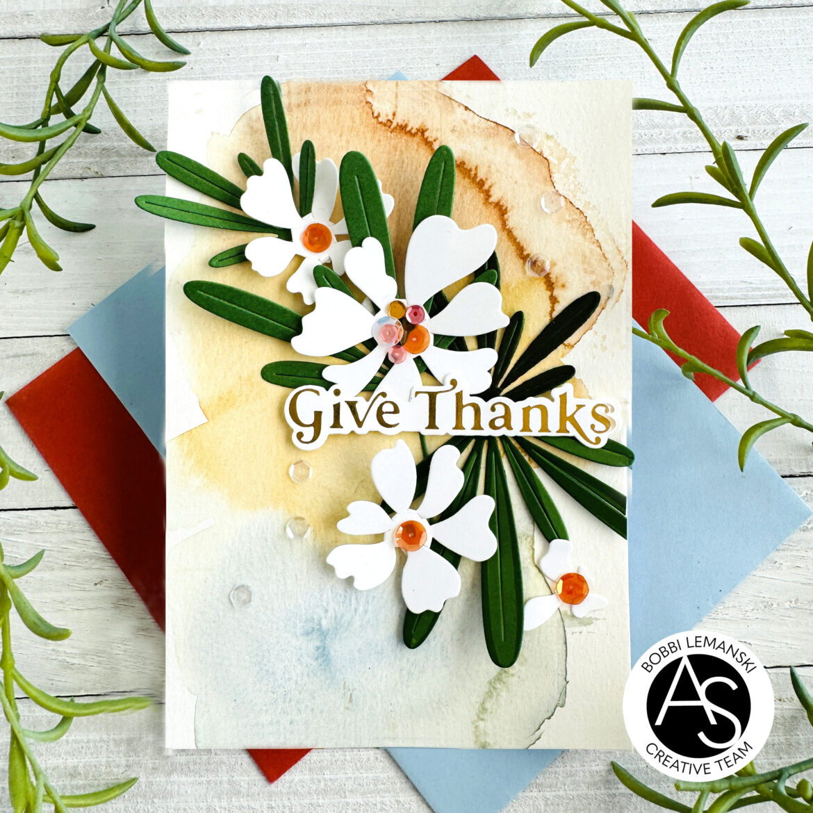 I hot foiled the sentiment, “Give Thanks” on white cardstock using gold foil and my Glimmer Hot Foil System. I die cut the foiled words using the coordinating dies that are part of the Give Thanks Hot Foil Plate and Die set. The words were attached using foam tabs, amongst the florals. To finish this card, I added a few see-through sequins around the florals for a little sparkle.
