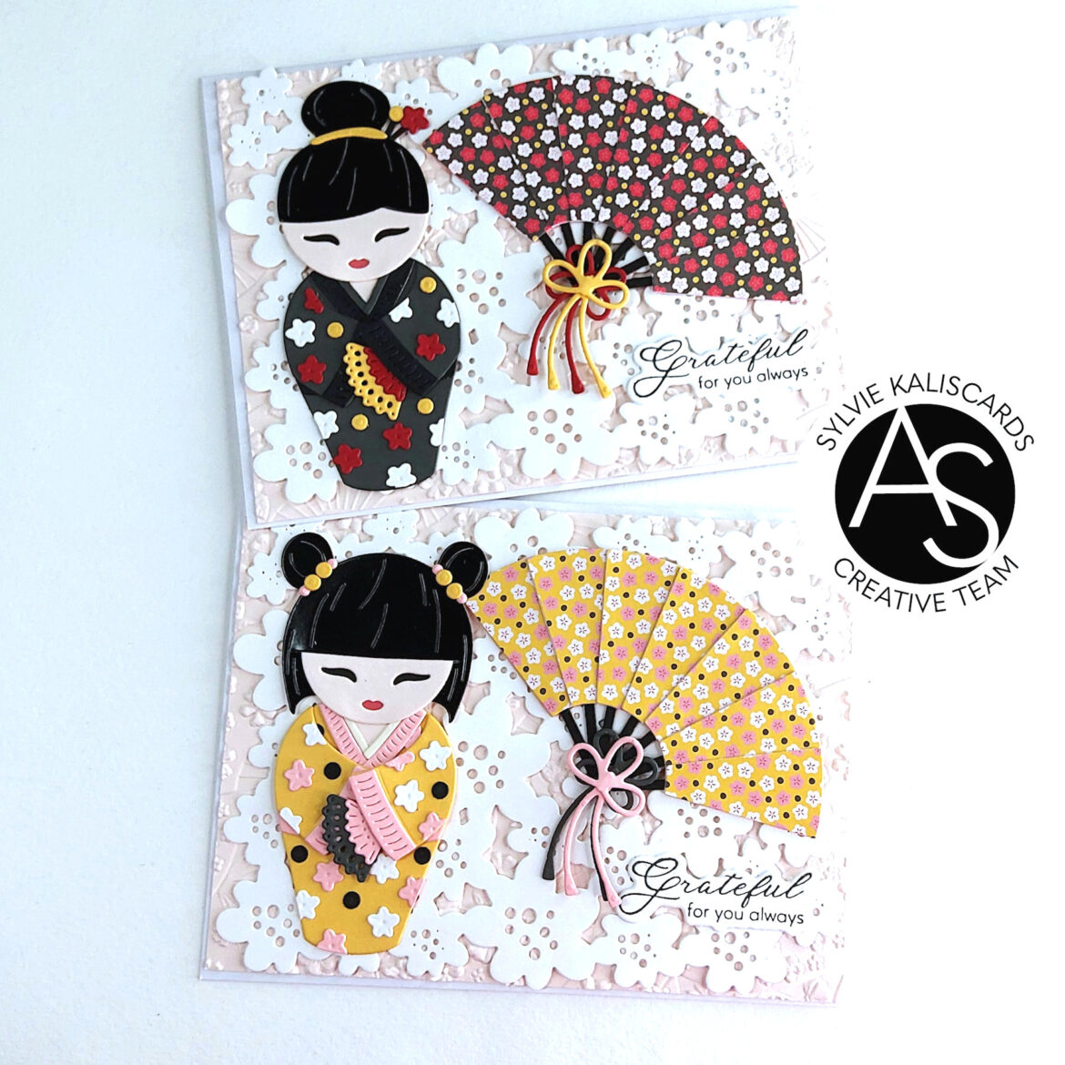 This is Sylvie @kaliscards with a couple projects for combining a few products from the ‘Spring in Kyoto’ release with Spellbinders. Once again, I played with origami paper from my stash to created a set of cards coordinating the fans and kimonos.