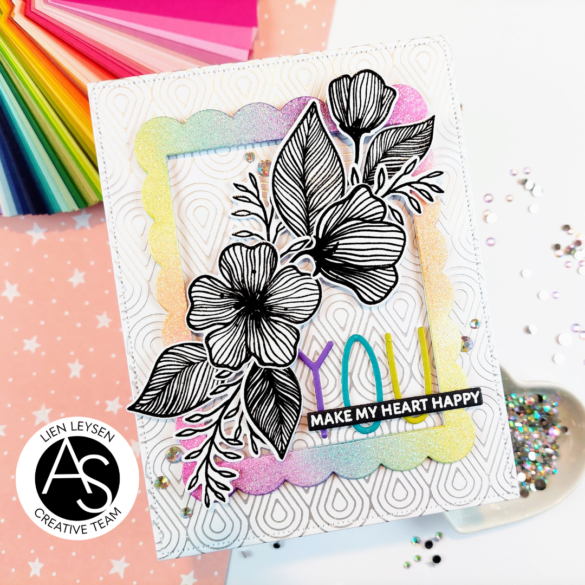 I used a rainbow of inks to add color to the white glitter cardstock and started assembling my card. I glued the hot foil background to my cardbase and propped the frame and the blooms up on some foam tape. For my sentiment I used the Foxtrot Alphabet die set to create a You and the sub sentiment is from the Happy Blooms stamp set. The coordinating dies also cut out all the sentiments in this wonderful set.