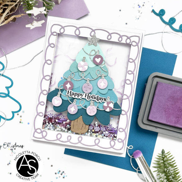As a last things I added the lilac ribbon die cut all around the frame and the string sentiment in the middle of the Christmas tree; I made it using the Merry Mail stamp set and the coordinate Merry Mail die set.