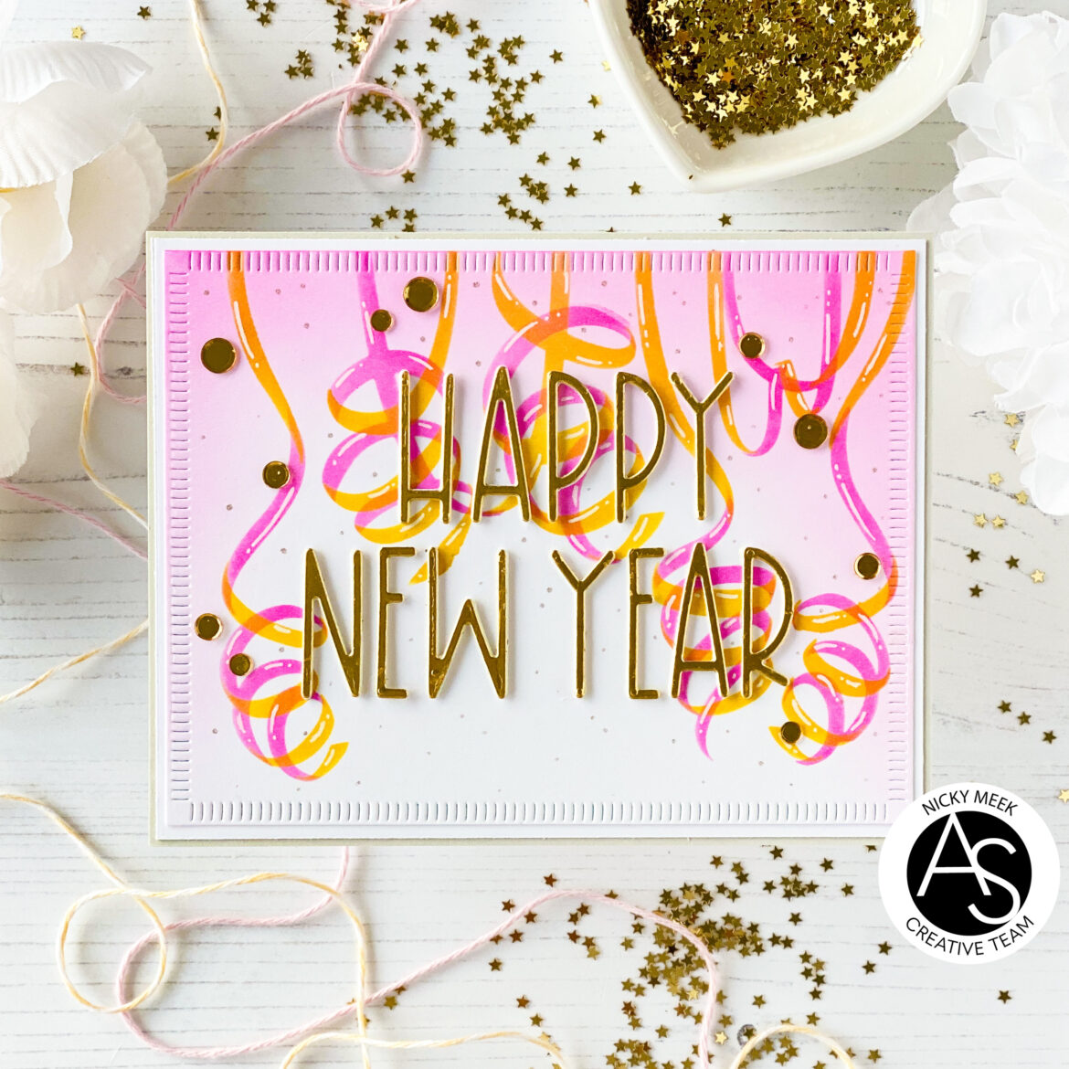 This is Nicky with you today on the Alex Syberia Designs blog and I’m sharing a cheerful card idea to wish someone a Happy New Year! This card showcases Alex Syberia’s Carnival Party Stencil & Die Set together with their Foxtrot Alphabet Die Set and Good Day Quilted Rectangles Die Set.