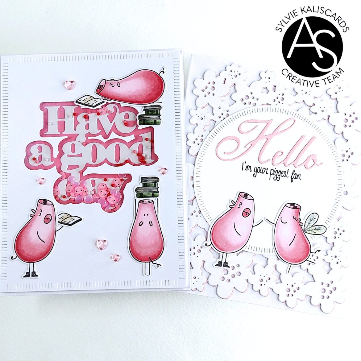 I also stamped the two pigs on a piece of white cardstock, colored them with Copic markers and used the coordinating dies to cut them out. I finally adhered them onto the front panel, with liquid adhesive. I then added a little glitter on the piggie wings.