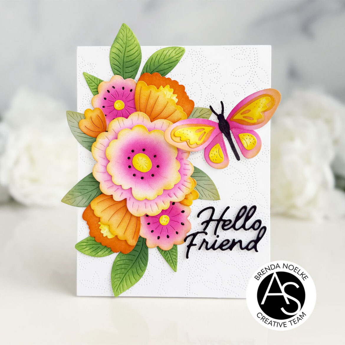 For the background, I die-cut the Meadow Magic Cover Die from white cardstock and adhered it to an A2 white card base. The flowers and leaves were arranged along the left-hand side of the background and adhered using liquid glue. The butterfly was adhered by only adding liquid glue behind the body, allowing the wings to pop-up.