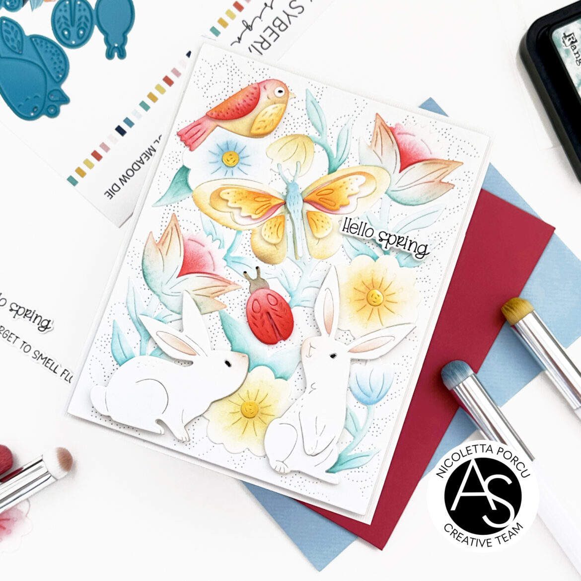 At that point I glued the Spring Meadow panel over the card and as a last thing I added the little “Hello Spring” sentiment I made using the Hoppy Easter stamp set and coordinate dies.