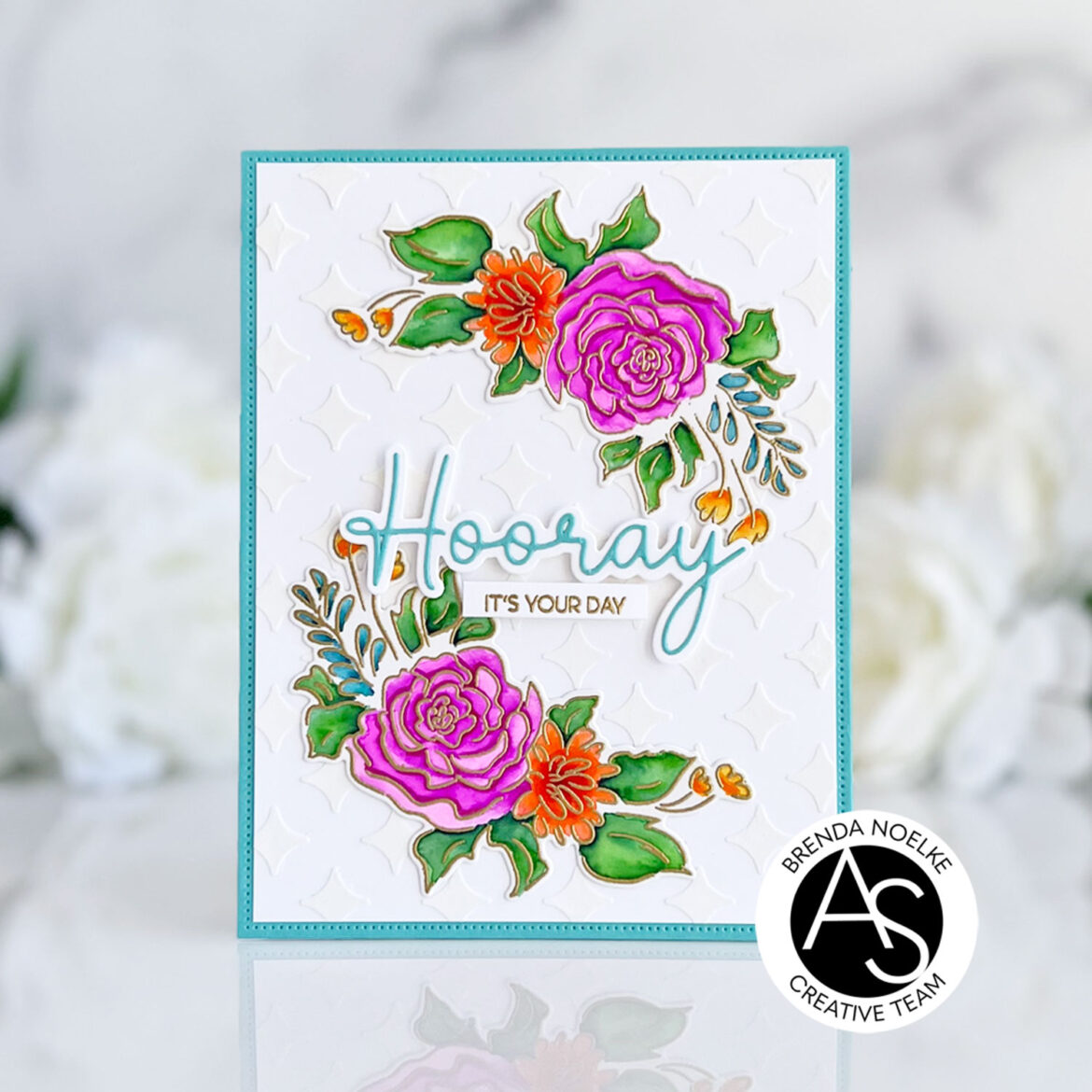 The sentiment is a combination of the Congrats & Hooray Die Set and the Celebrations Sentiments Stamp Set. “Hooray” was die-cut from aqua and white cardstock and the sub-sentiment was gold heat embossed onto white cardstock and cut out with the Thin Strips Cover Die. The florals were adhered in opposite corners with liquid glue and the sentiment was popped up with foam tape.