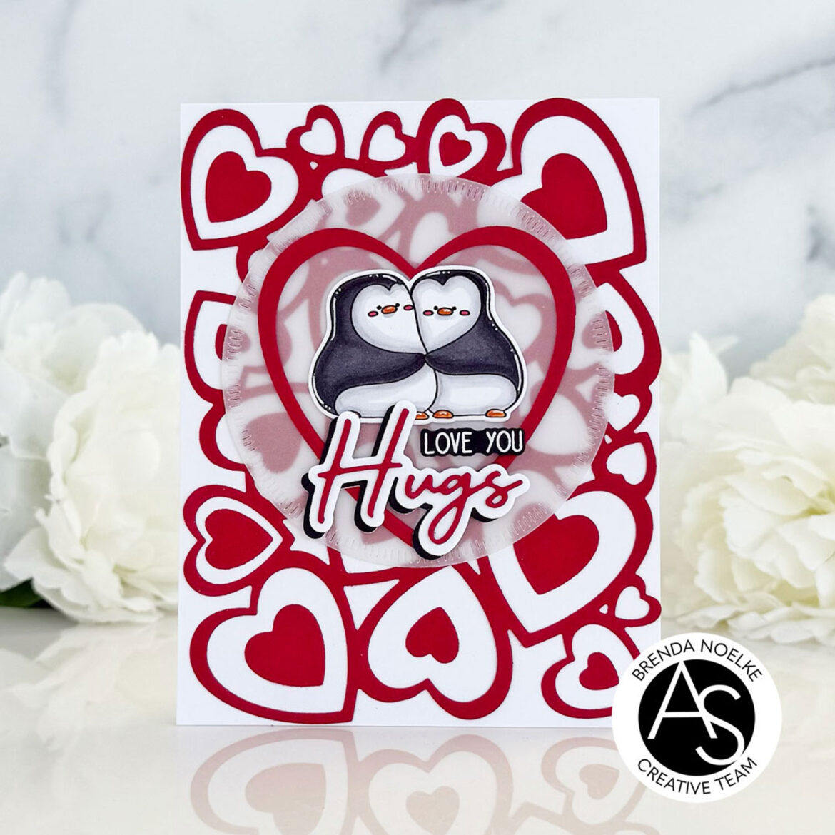 For the background, I die-cut the Heart Collage Die from red cardstock and adhered it to an A2 white card base using liquid glue. I adhered some of the solid hearts into the larger openings. The smallest circle in the Nested Stitched Circle Die Set was cut from vellum and a heart from the Endless Hearts Die was adhered to the circle, along with the penguins. I adhered the circle to the background, adding liquid adhesive only behind the die-cuts.