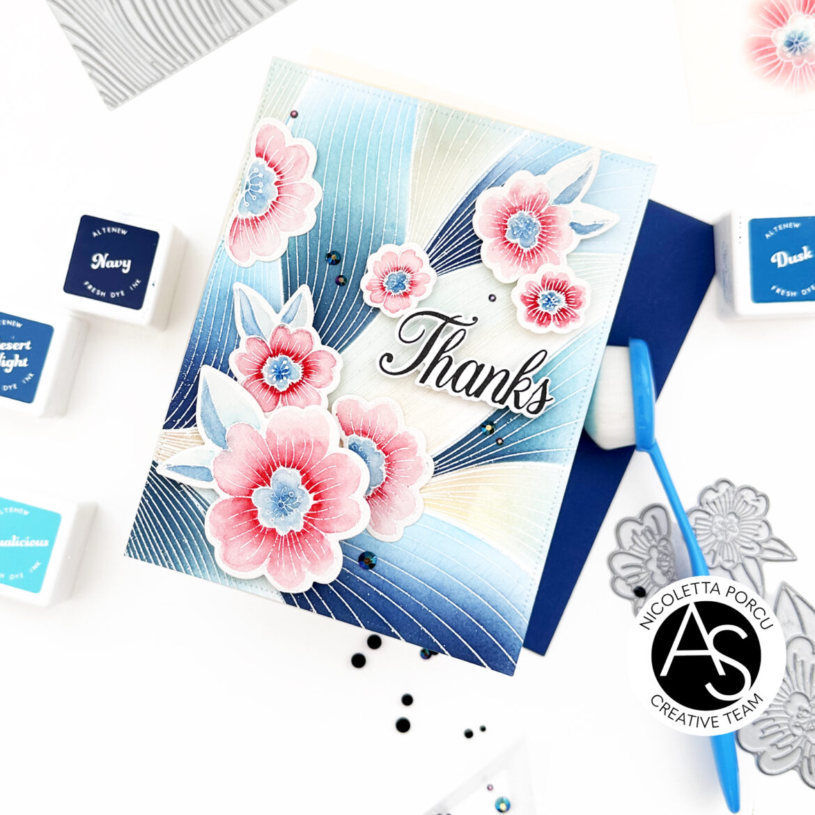 To make my card I started by using the Abstract Background Press Plate to emboss in white the image on a piece of Neenah paper and create my background. Then using the coordinate Abstract Background Stencil set I added color to the background using various blue-green and dark Bkue of Dye Fresh Inks by Altenew,