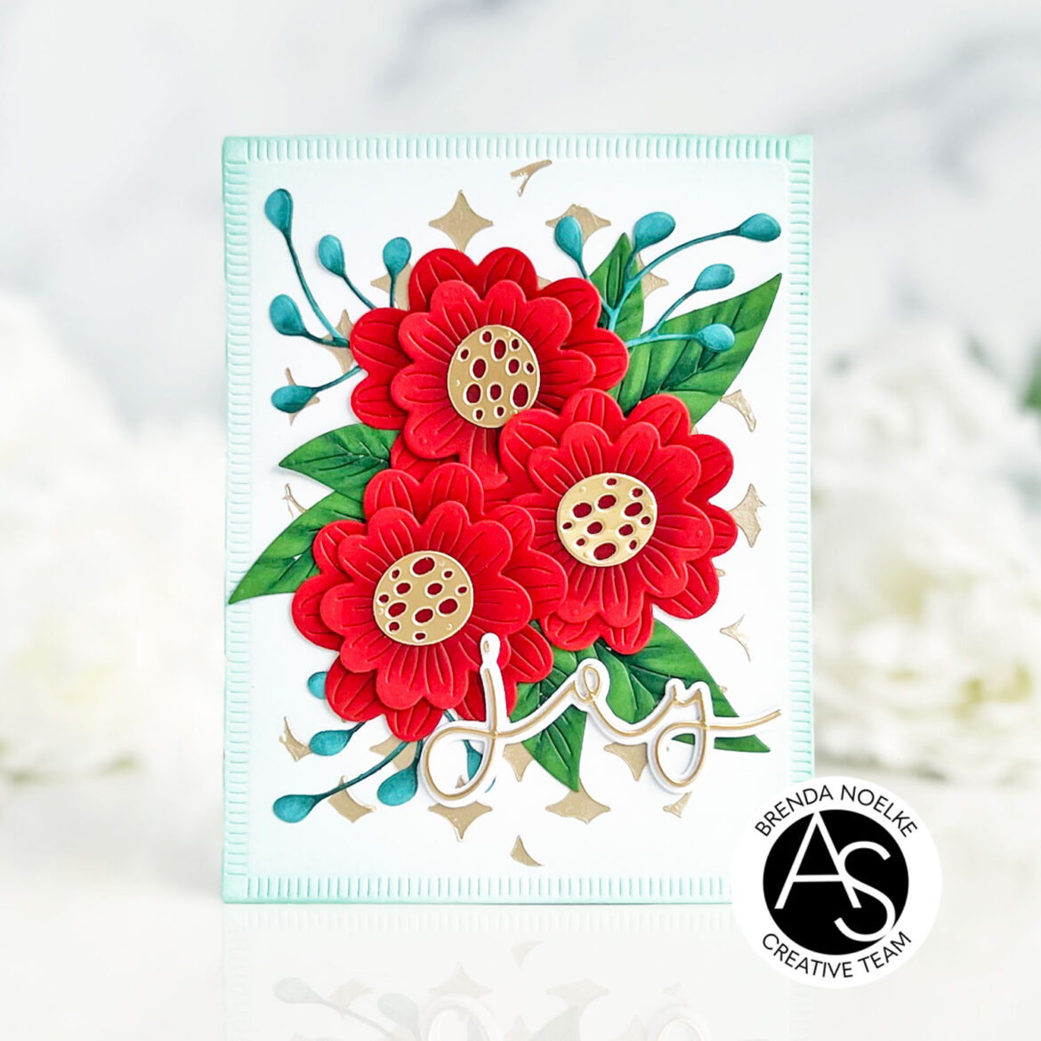 I started by die-cutting the flowers and leaves from red, green, teal and matte gold cardstock using the Andalusia Wildflowers Die Set. I used detail blending brushes and dye inks to add shading to the die-cuts.