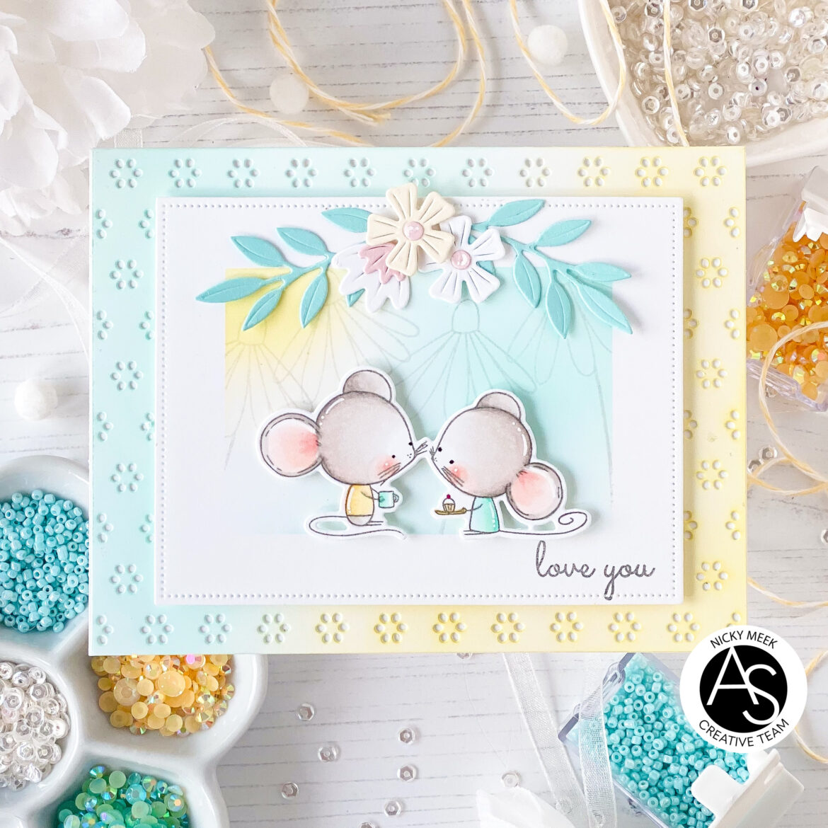 With the second white panel of cardstock, I die cut using a die from the Nested Scalloped Frames Die Set, then I masked around the edges and ink blended with the same inks used in the background panel. I kept the masking in place and came in with the flower image from Sweet Friend and using a light grey ink I stamped the image repeatedly. I then removed the mask and stamped the ‘love you’ sentiment with a darker grey ink in the corner. This panel was backed with white craft foam and adhered to the background.
