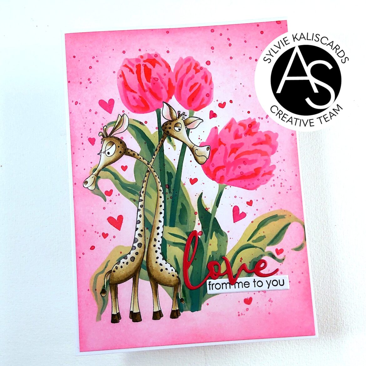 Sylvie @kaliscards here. Today, I have a cute Valentine card and giraffe-ic love. I gave these cute giraffes a little twist by slightly bending their necks so they are hugging each other. Hope you like this idea!