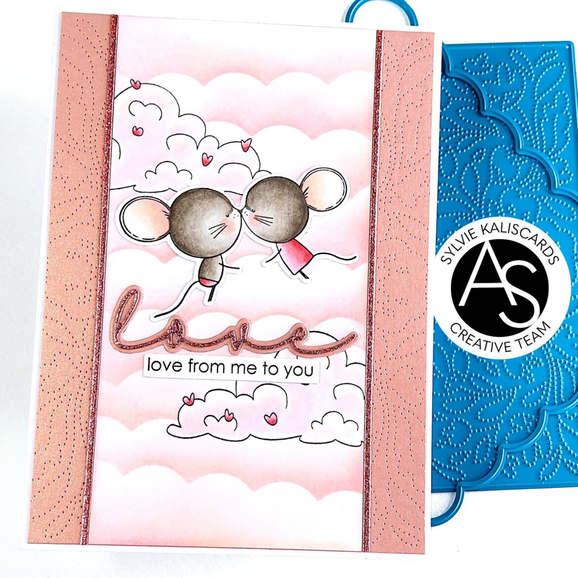 I stamped the cute mice couple on white cardstock and colored all the images with Copic markers. I used the coordinating dies to cut out the mice.