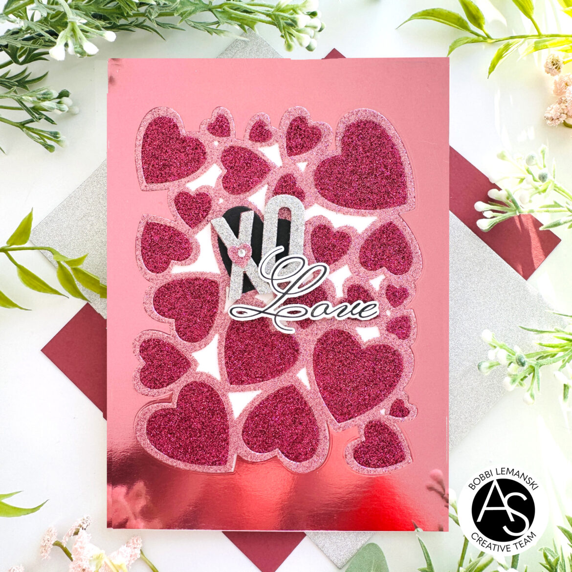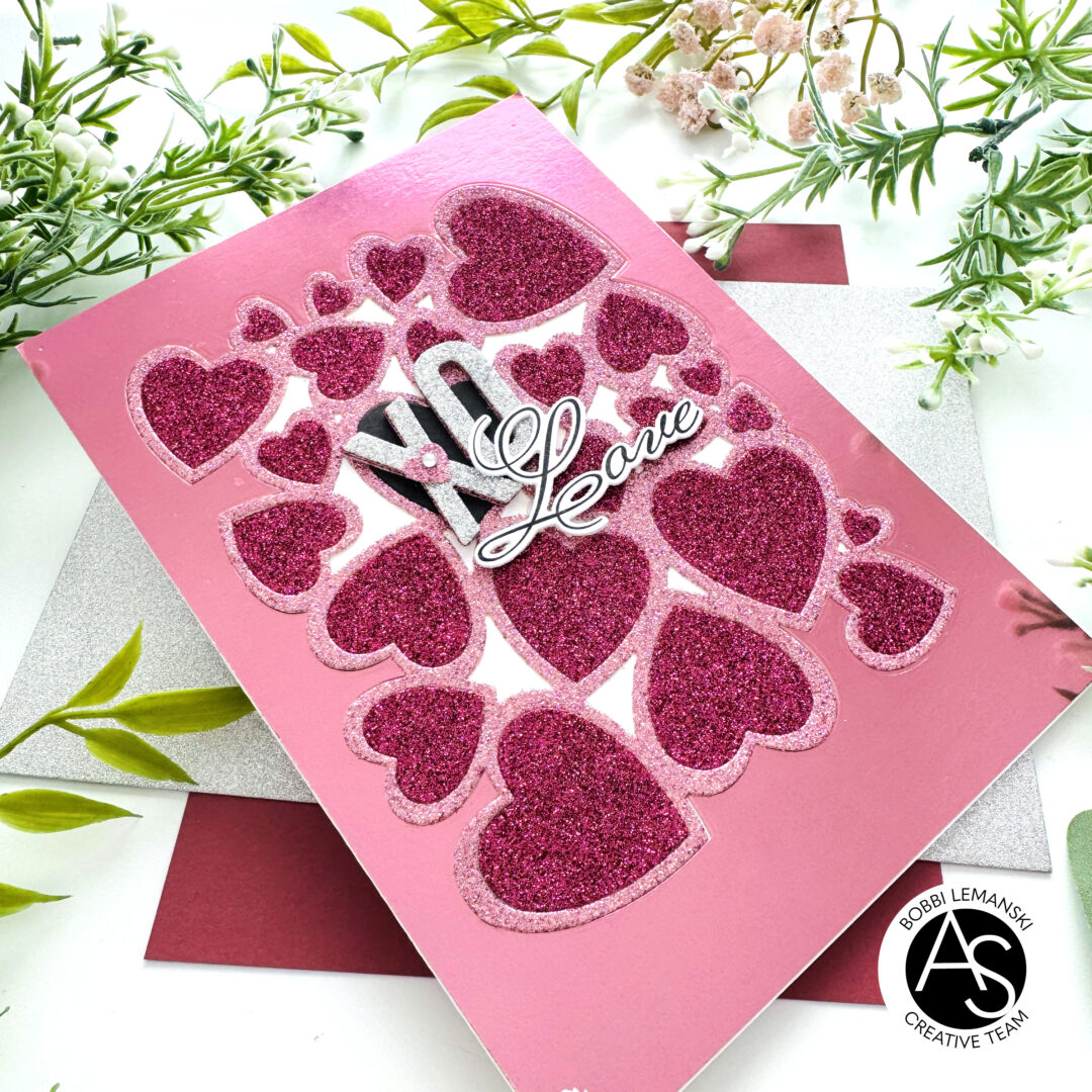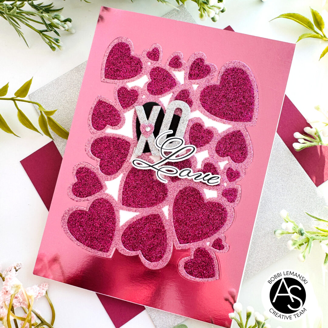 Hi friends. This valentine greeting features not only hearts, but all the pretty shiny and glittery papers by Alex Syberia Designs. Glitter doesn’t end with Christmas cards. It just keeps shining right into February with valentines! This valentine is glittery and bright and sophisticated and stylish all at the same time. I used the following Alex Syberia Designs products: