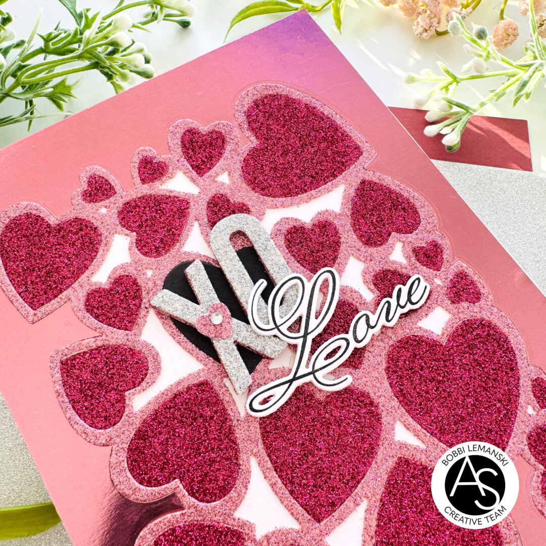 I die cut the X and 0 from silver glitter cardstock from the Black and Silver Mix Cardstock 27 pack. To make the letters extra thick, I die cut four of each letter, stacked and then glued them together. I also stamped and die cut the “love” scripted word using black ink and the From Our Hearts stamp set and coordinating die set. I attached the letters to the front of the black heart and attached the scripted Love word, overlapping the word over the letters slightly. I embellished the X with a tiny pink glittery heart and a sweet rhinestone gem sticker. This card is so pretty. The collage die just frames these glittery hearts perfectly.