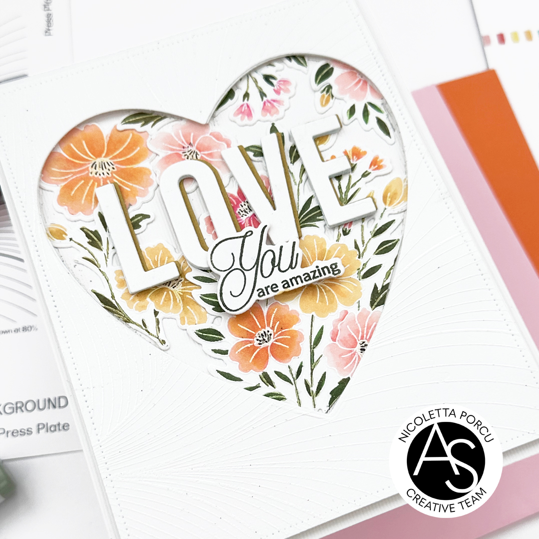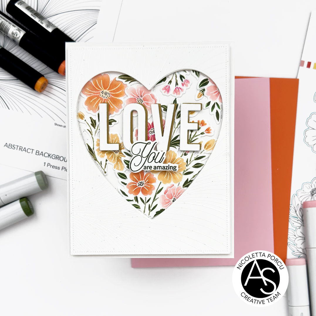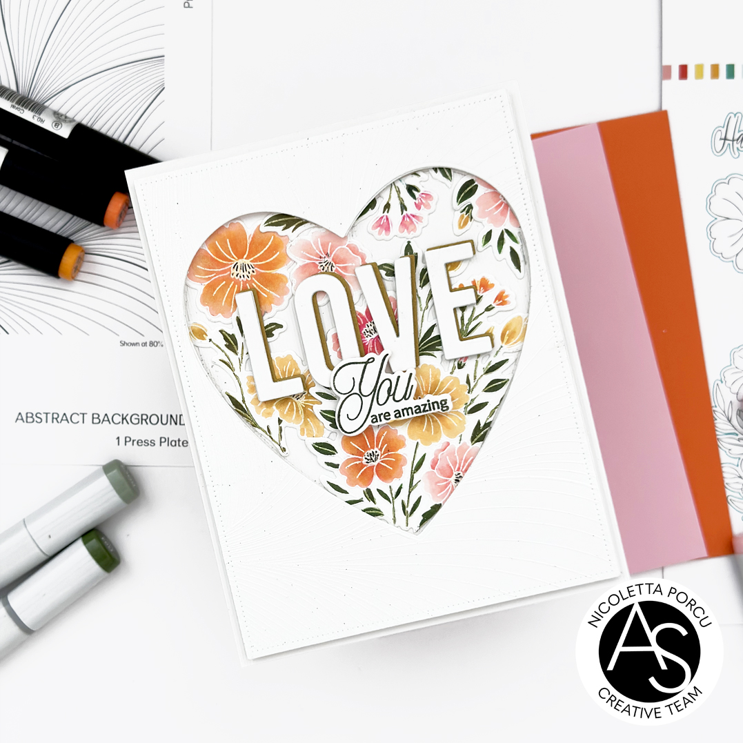 Next up I die cut the Love sentiments in six layers, 5 in white and one in yellow-green; I glued all together putting the yellow one at the base slightly offset and I glued it on the flowers and then as a last thing I added the stamped sentiment from the Abstract Background stamp set and die cut with the Abstract Background die set.