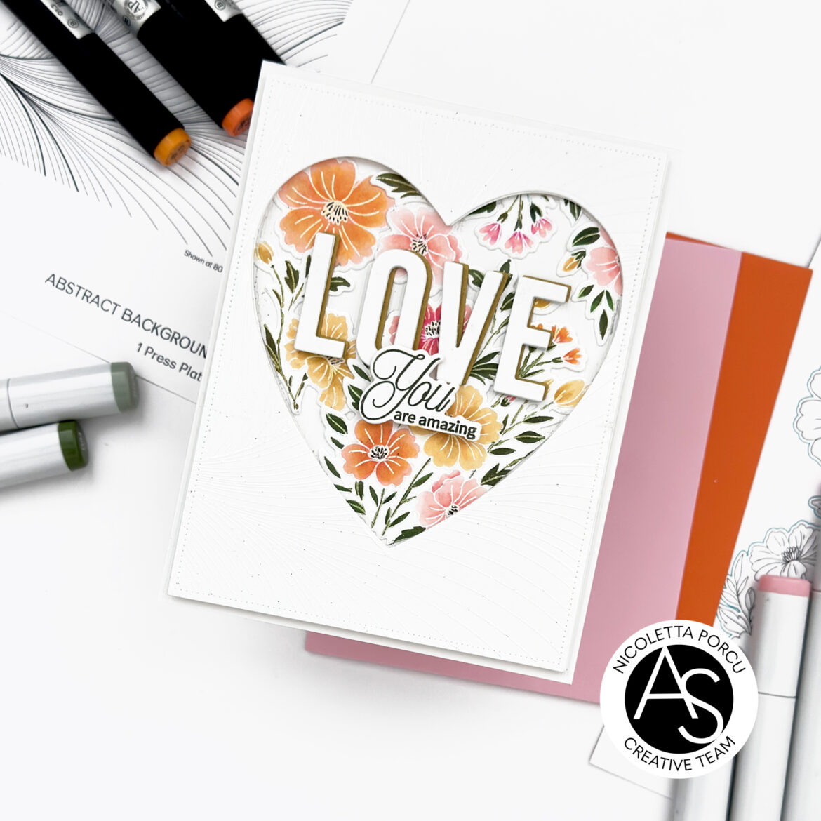 Next up I die cut the Love sentiments in six layers, 5 in white and one in yellow-green; I glued all together putting the yellow one at the base slightly offset and I glued it on the flowers and then as a last thing I added the stamped sentiment from the Abstract Background stamp set and die cut with the Abstract Background die set.
