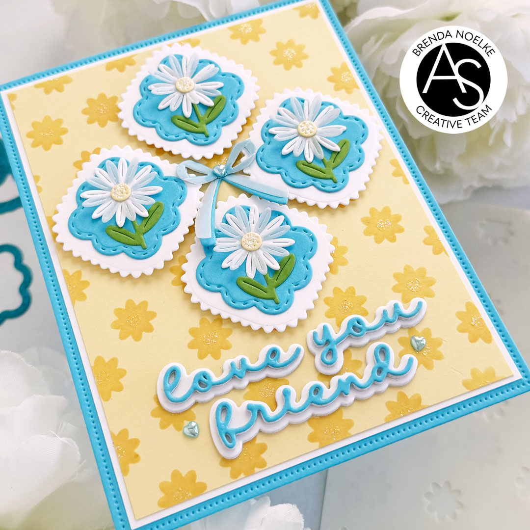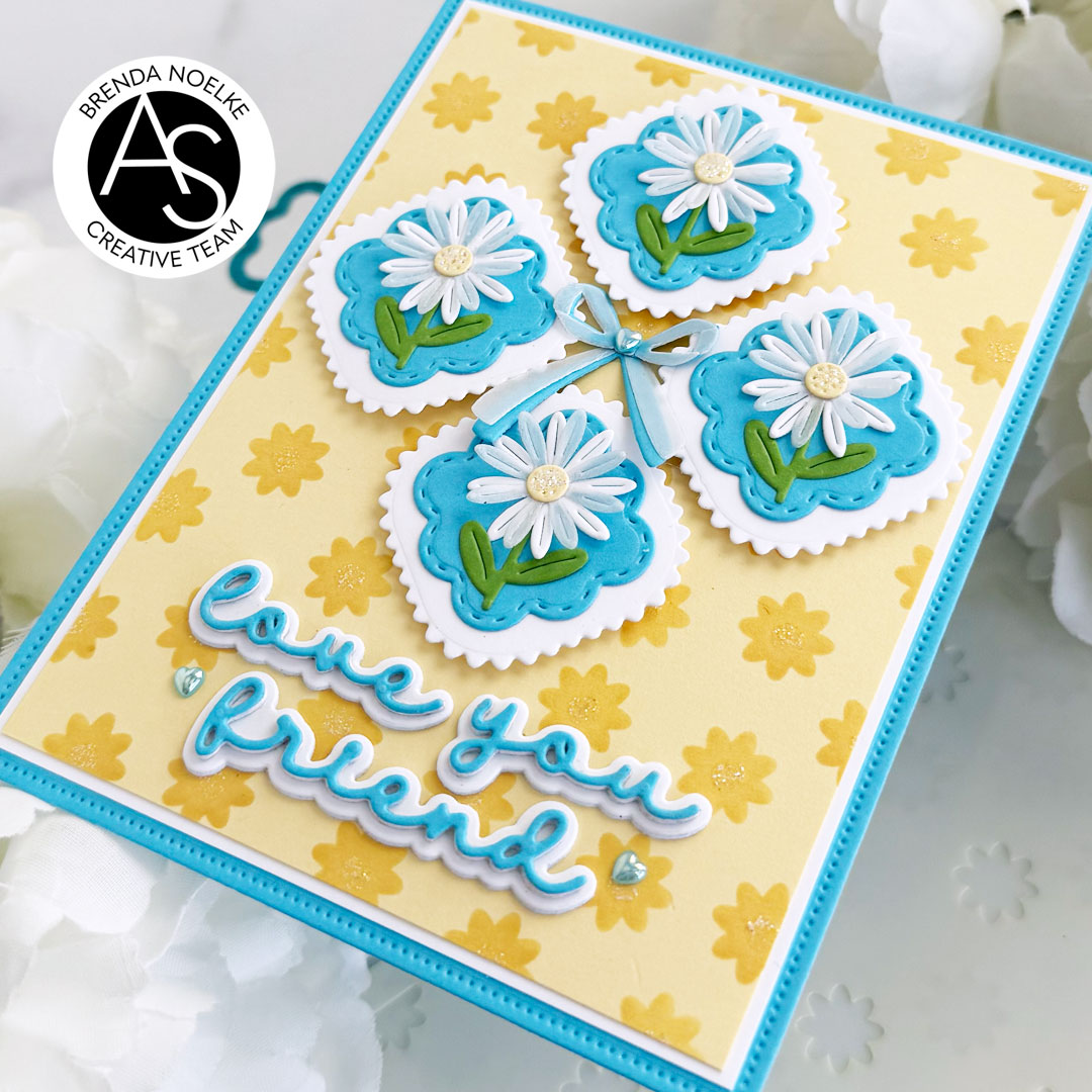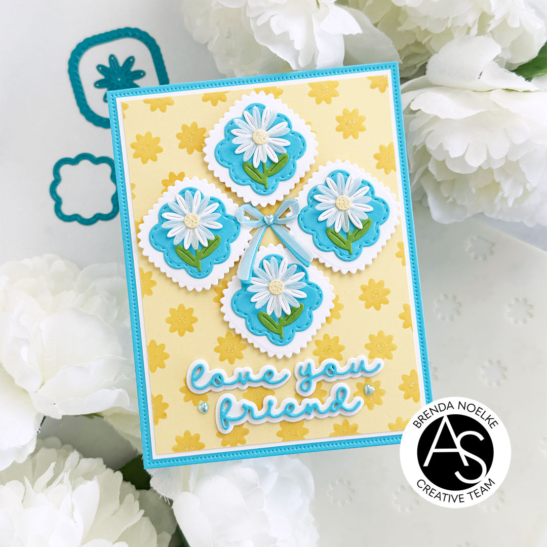 The first three layers of the Tiny Flowers Stencil Set were stenciled onto light yellow cardstock with darker yellow dye ink. I used iridescent sparkle gel for the last stencil to add the centers to the flowers. Once the gel was dry, I trimmed the panel and matted it with a panel of white cardstock. The largest rectangle die in the Nested Scalloped Frames Die Set was cut from blue cardstock, then the yellow and white layers were adhered with liquid glue. The floral squares were arranged and popped up with foam squares and the bow was adhered in the center with liquid glue.