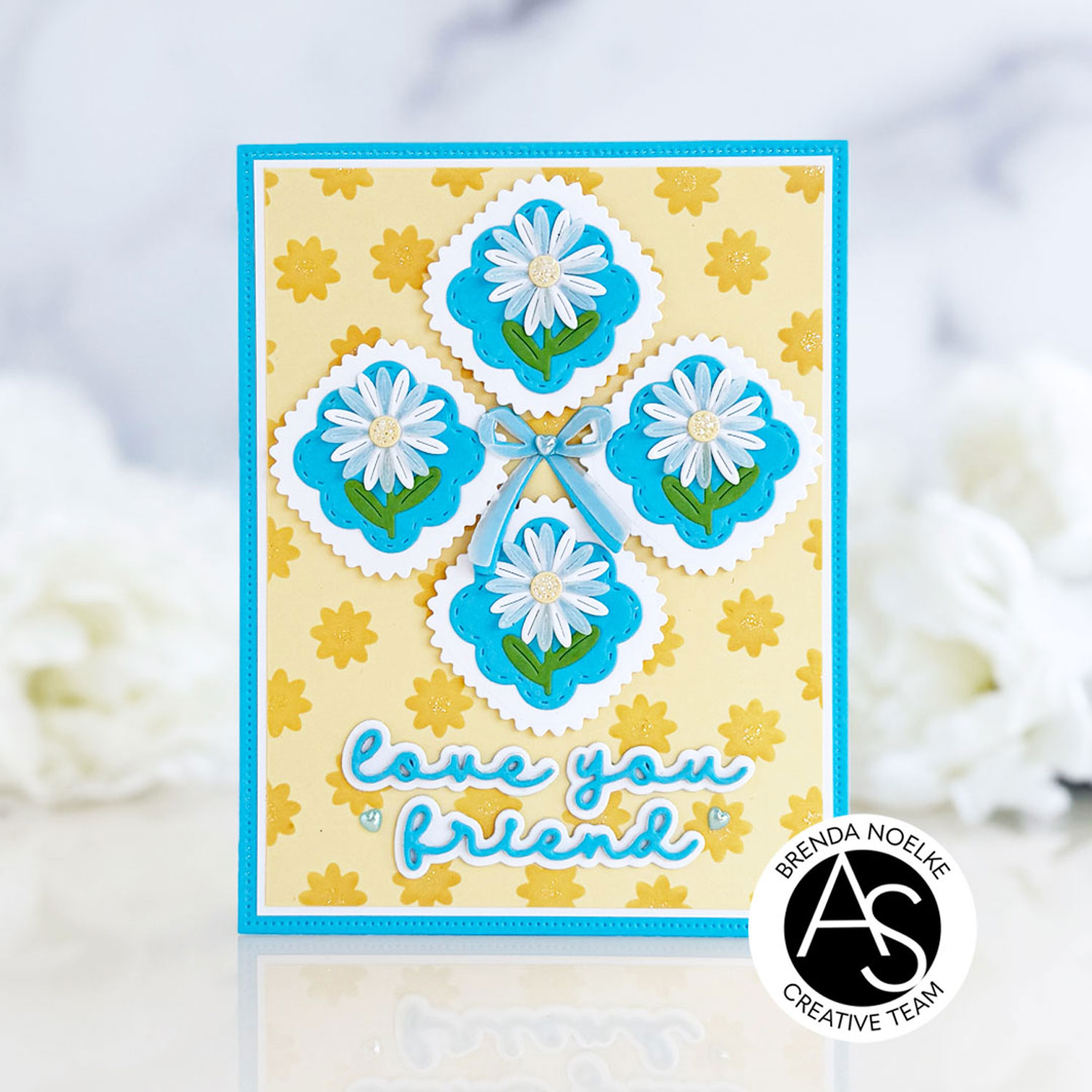 The first three layers of the Tiny Flowers Stencil Set were stenciled onto light yellow cardstock with darker yellow dye ink. I used iridescent sparkle gel for the last stencil to add the centers to the flowers. Once the gel was dry, I trimmed the panel and matted it with a panel of white cardstock. The largest rectangle die in the Nested Scalloped Frames Die Set was cut from blue cardstock, then the yellow and white layers were adhered with liquid glue. The floral squares were arranged and popped up with foam squares and the bow was adhered in the center with liquid glue.