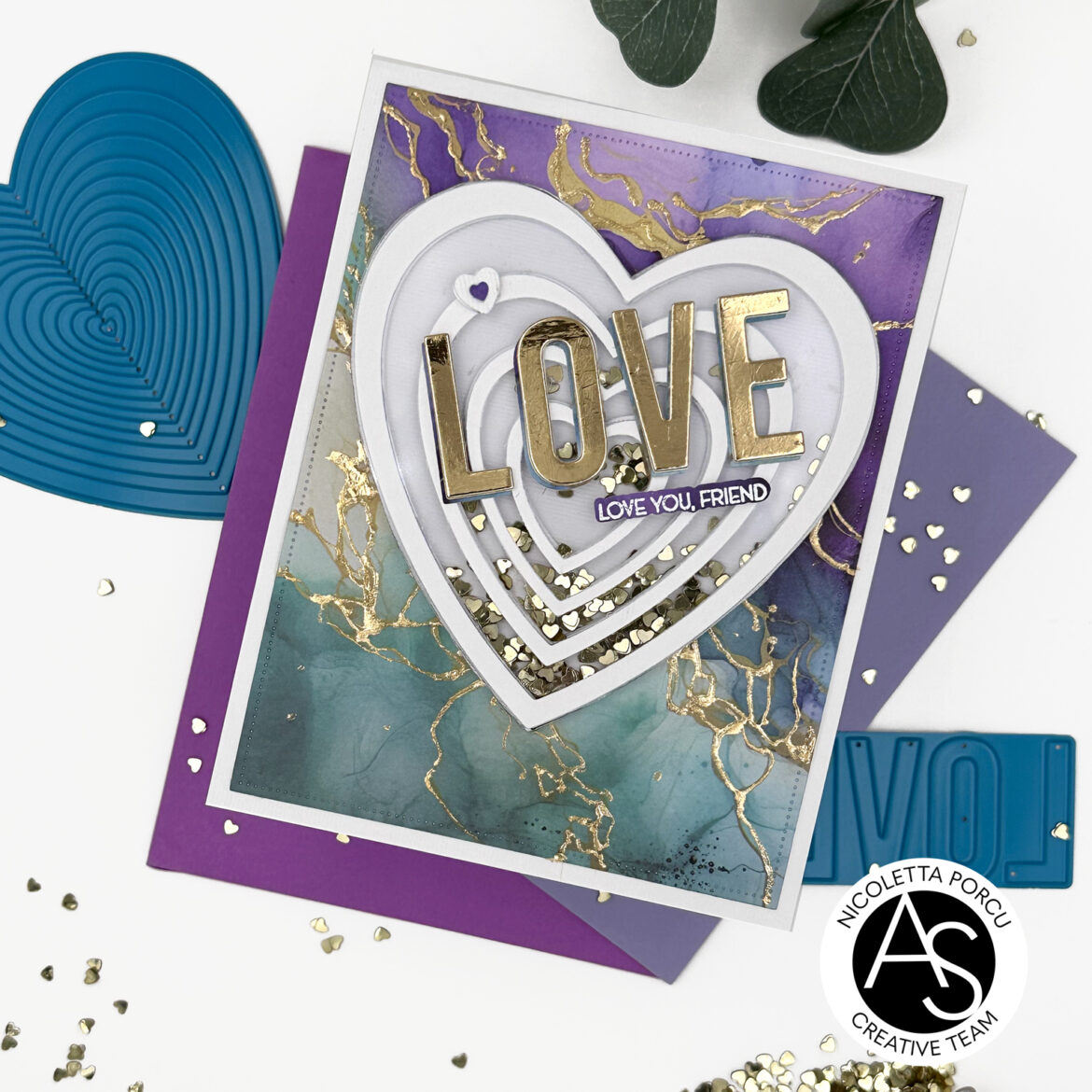 Next up I die cut the big Love sentiment using the Love & Xoxo die set, I die cut the top layer from a gold metallic cardstock, the base layers from the same marbled paper I used for the background. and others 2 layers from a white cardstock. I glued all together and I placed it diagonally on the shaker heart.