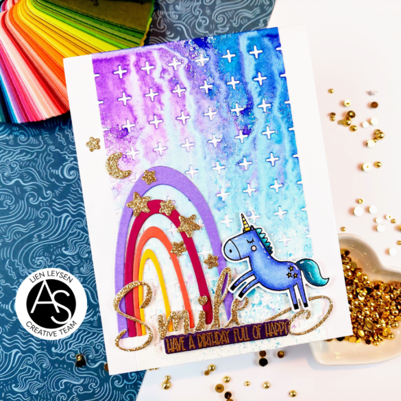 I trimmed the sides of this background down and glued it onto a top folding white notecard using Bearly Art Precision Craft Glue. To add more of a scene for my unicorn I used the fun Quirky Rainbow die set. I cut it once from white cardstock to add dimension and once from a couple warm colors of cardstock. I also wanted to add some sparkle so I used the coordinating dies from the Always Be Yourself set to cut stars and a moon from gold glitter cardstock.