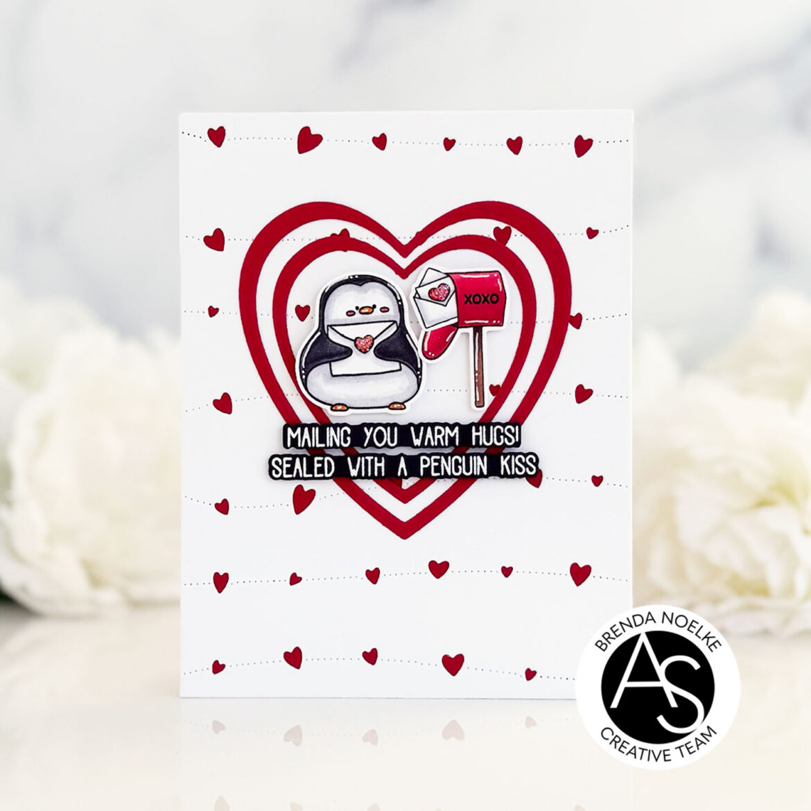 For the background, I die-cut the Heart Garland Cover Die from white cardstock and adhered it to an A2 panel of red cardstock. The Endless Hearts Die was cut from red cardstock and two of them were adhered with liquid glue. The penguin and mailbox were popped up with foam tape.