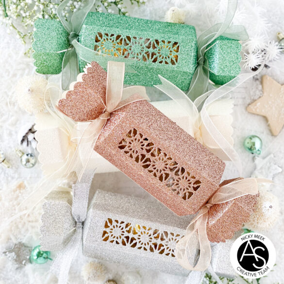 I used sparkling cardstock from Alex Syberia’s new range of cardstock and literally just followed the clear instructions that are included with the Christmas Cracker Die Set. You can get a real production line going! I also chose to die cut decorative window openings with one of the included dies, so each cracker which has six sides and has two windows but of course this is optional if you want to hide the contents. I constructed the crackers and used coordinating ribbon to secure one end, I filled them with chocolates and then tied the other end.
